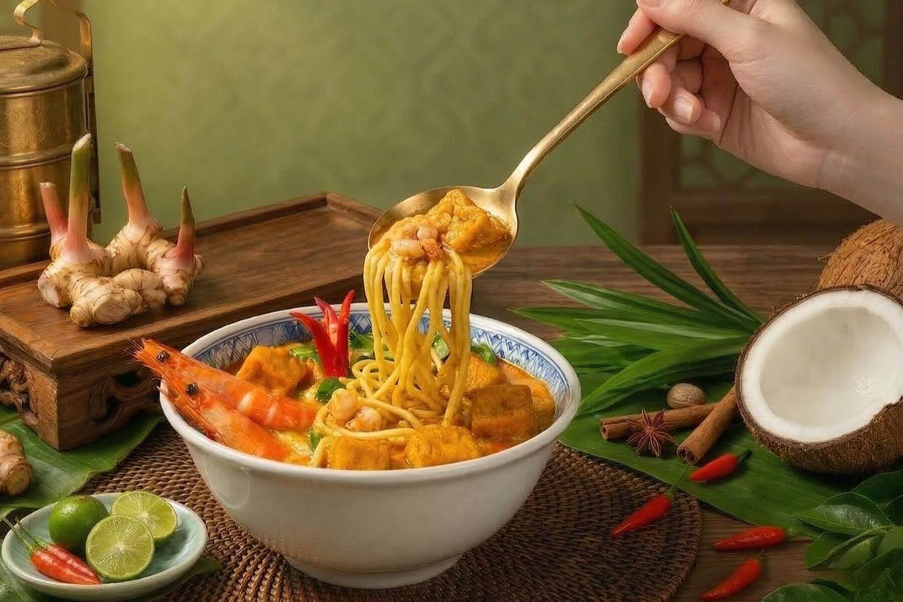 海鮮叻沙麵:現點現煮的溫潤風味,湯底以大量蝦頭、蝦米與「叻沙醬」慢火熬製,加入新鮮香茅、南薑與椰奶悉心熬製 。每一根油麵都緊緊吸附著辛香與奶韻交融的濃郁湯汁 。