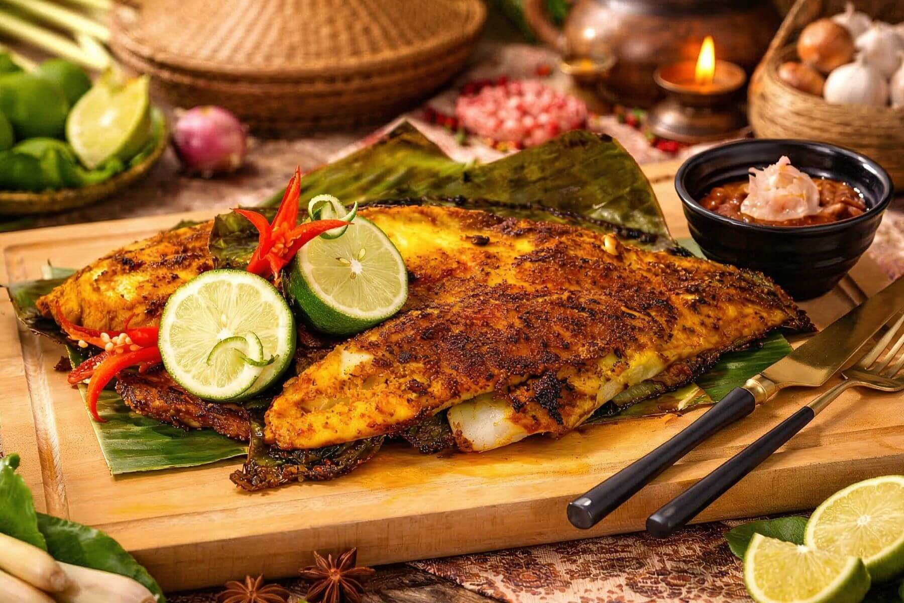 馬來西亞香蕉葉烤魚:嚴選鮮魚裹滿特製辛香料,再以香蕉葉包裹低溫慢烤,鎖住肉汁並釋放草本清香 。淋上新鮮金桔汁後的酸辣勁道,讓人彷彿置身大馬海鮮市集 。