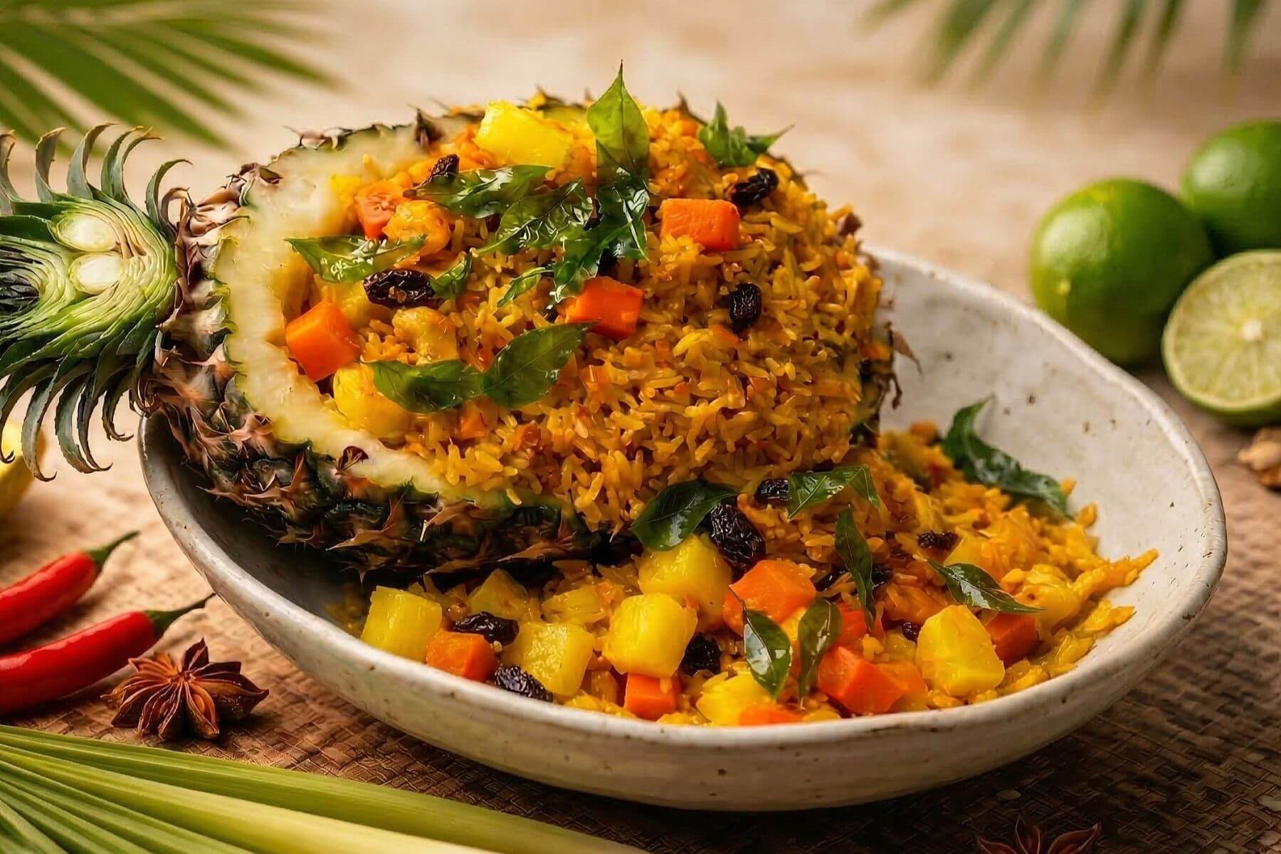 鳳梨炒飯:將熱帶果香封印於彈牙米粒中 ,主廚憑藉深厚翻炒功力確保米飯乾爽不油 ,果肉清甜巧妙中和了濃郁海味 。伴隨腰果與葡萄乾,在鹹甜平衡間留下回味無窮的餘韻 。