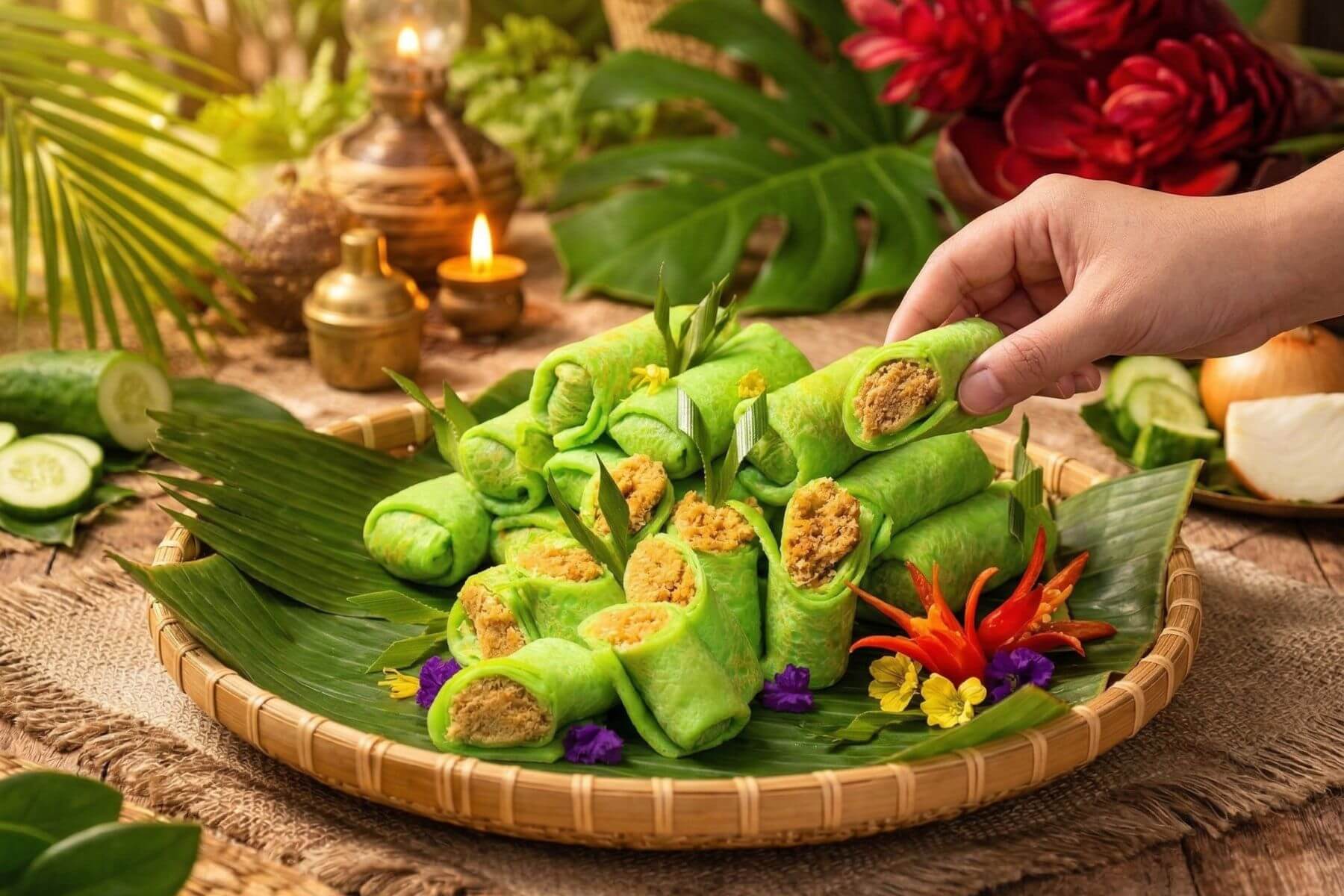 香蘭椰絲卷:當「東方香草」香蘭葉遇上馬六甲椰糖椰絲 ,透著綠意的軟糯餅皮散發迷人芬芳 。內餡慢炒至甜而不膩且口感濕潤,咬下的瞬間,餅皮軟糯與內餡細脆完美交融 。