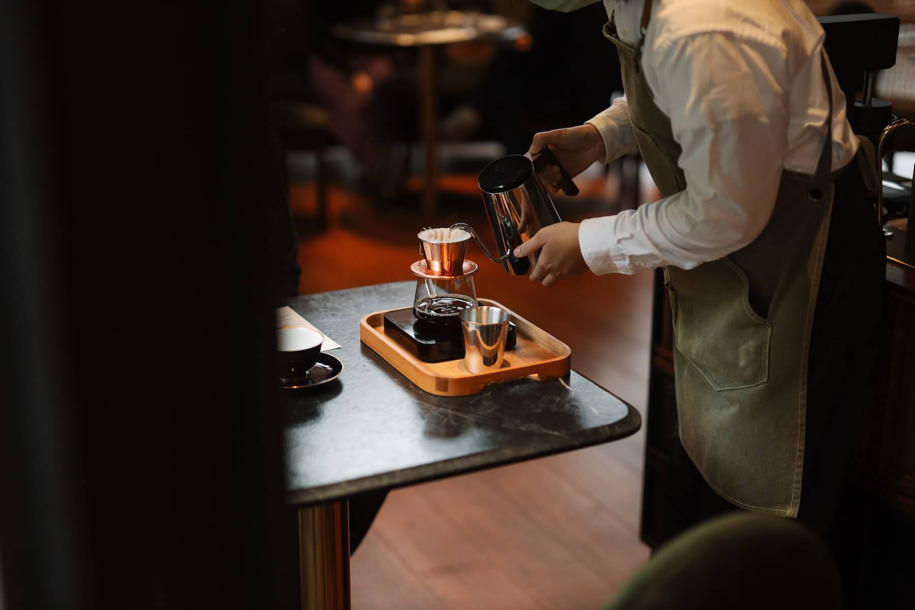 具體做法是什麼?他的答案是,把每一位客人當作是咖啡大賽的評審來服務。他們把營業時間切分成每半小時一個時段,每個時段最多接待二組客人,且分散在吧台區與一般座位區,店內兩組咖啡師團隊可各別為兩個區域的客人提供專屬桌邊服務,而不會互相打擾。