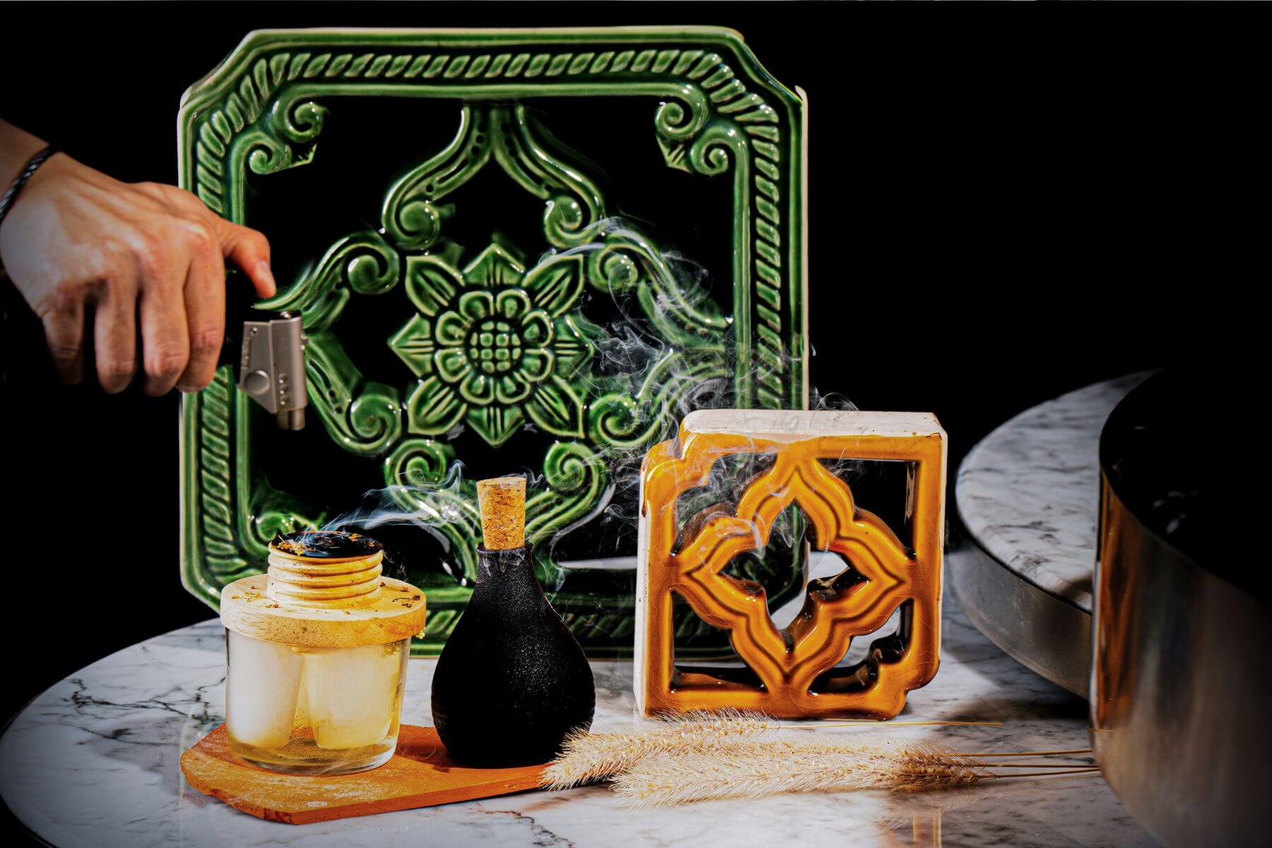 「三合院」是台灣早期最為常見的建築,此酒款融合蓬萊米、清酒和桂花,仿佛再現了曬稻的陽光,而刺蔥則象徵辛勤勞動的農夫們,此外,為了將這份情感具象化,因此選用紅瓦瓦片作為底座,頂部烤燒著桂花,彷彿重現了煙熏的畫面。