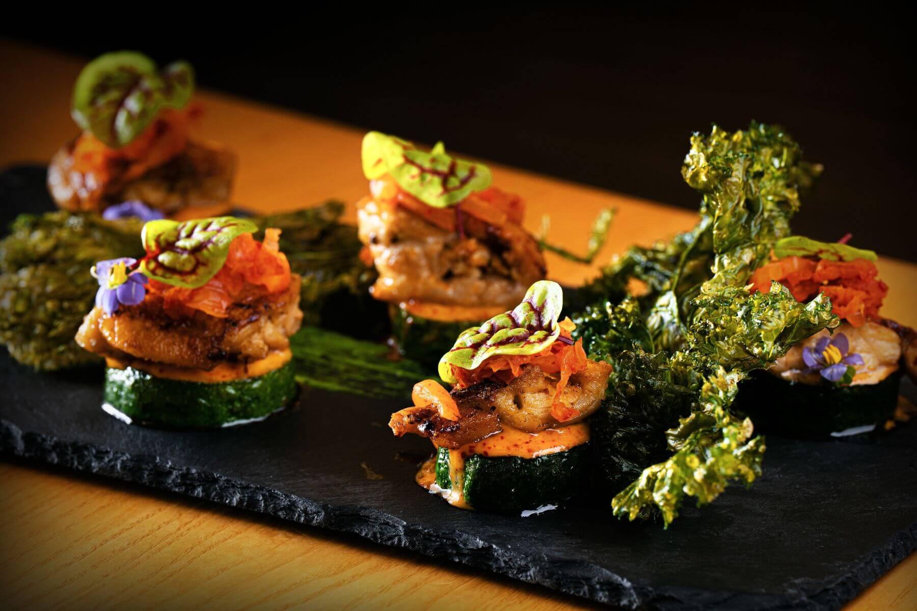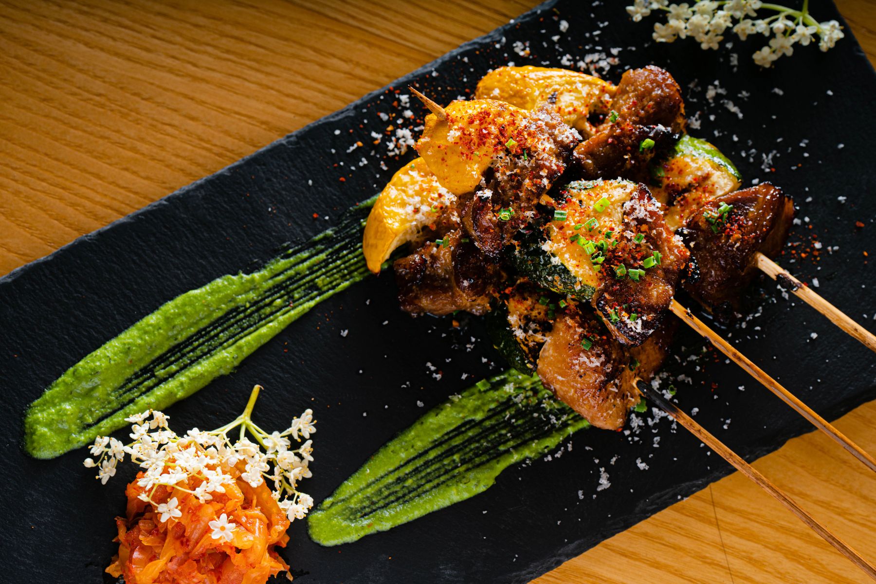 例如「醬燒無骨雞翅」將雞翅去骨後進行燒烤,在高溫炙烤下大幅降低外皮膠質所帶來的油膩感,接著裹上以東北亞經典食材調製的醬料,酸爽韓式泡菜、微辣的日本七味粉及清新柚子醬,三者風味各異卻又巧妙且平衡的交織在一起,不僅帶來味蕾上的驚喜,更是飲食文化的結合。