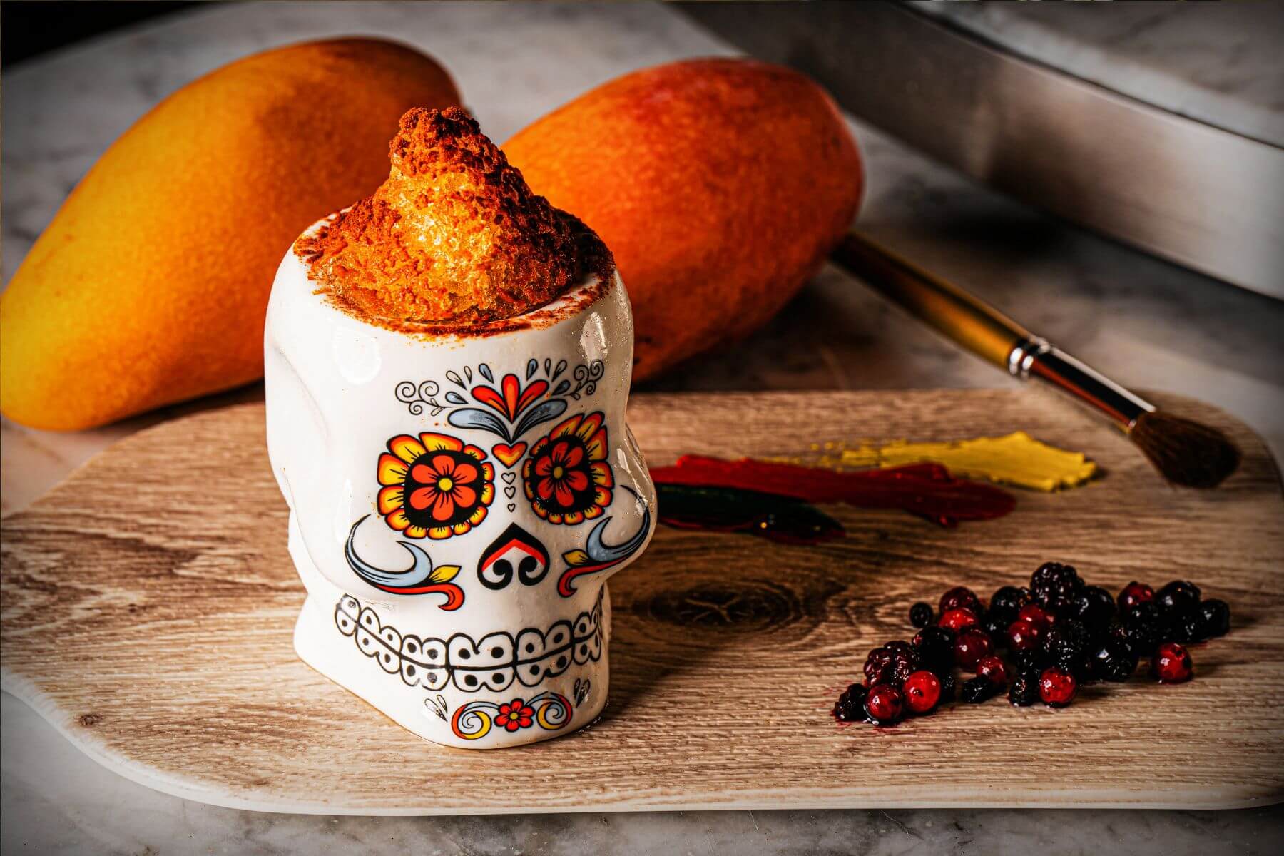 「瓦哈卡的街道」則展現亡靈節的繽紛色彩,伴隨著活力四溢的瑪利亞奇樂隊,他們的表演像是一場嘉年華,將墨西哥文化的豐富元素融入其中。選用台灣特有的水果芒果與桑椹,與墨西哥國寶-龍舌蘭酒相得益彰,共同演繹出瓦哈卡充滿魅力的街景,而微辣的紅椒粉則象徵著墨西哥人對生活的熱情與活力。