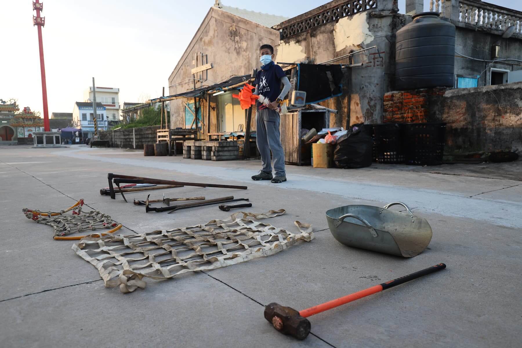 第二天開始步道施作工程,早上7點,施作工具排列在啟明宮前的廣場,步道師講解工具功能及注意事項,眾人戴上安全帽、提起工具,往山上移動。