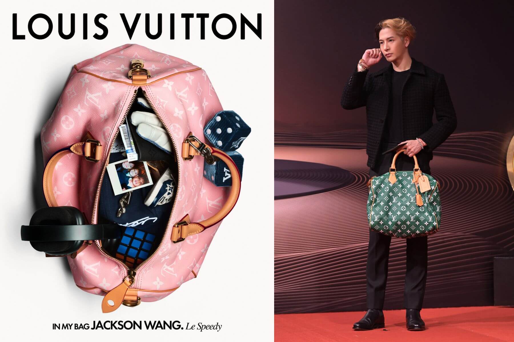 身為品牌大使的王嘉爾選擇了粉紅色款,包身還扣著一對可愛的絨毛骰子 。包內物件融合了他的多重身份:專業耳機與樂譜代表音樂靈魂,西洋劍手套回顧了運動員生涯,而家人的拍立得相片與魔術方塊則揭露了他感性又純真的一面 。