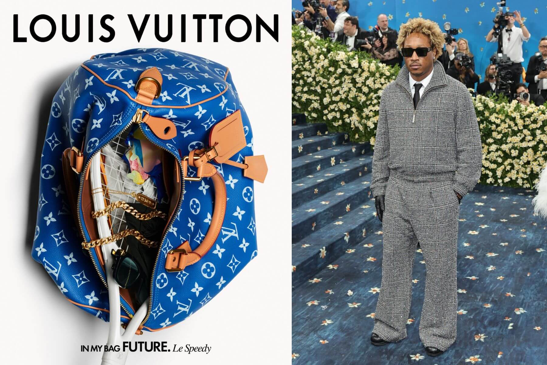 葛萊美獎饒舌天王的包內空間運用極具個人特色,竟然直接塞進了一支網球拍,在奢華與運動間取得奇妙平衡 。此外,包裡還閃爍著幾條鑽石金鏈與 Monogram 吊墜項鍊,當然也少不了緩解壓力的軟糖以及一雙預備換上的乾淨球鞋 。