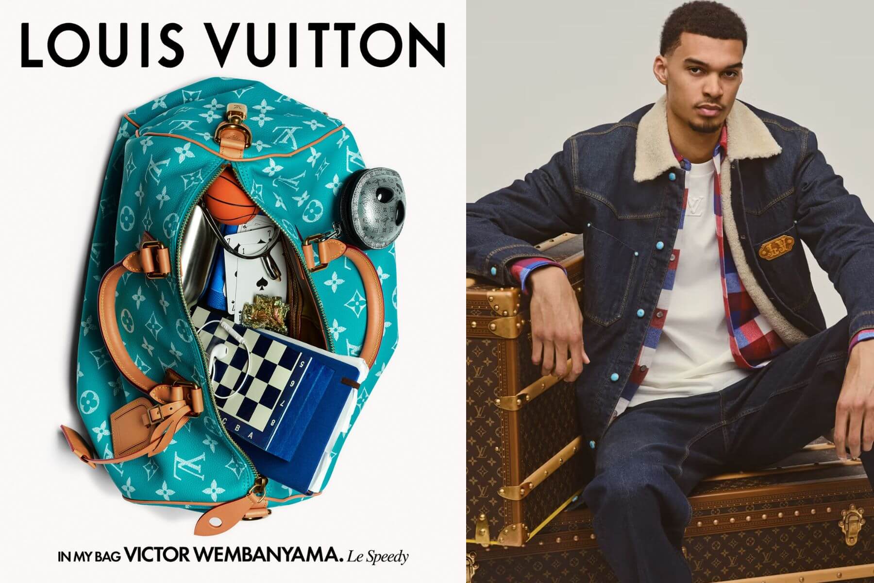 NBA 紀錄保持人的包包上掛著一個搶眼的外星人 Monogram 吊飾,完美契合他的綽號 。包裡裝著一顆迷你的舒壓籃球、一副撲克牌、一支象徵好運的馬刺(Spur)和一副傳統的有線耳機,充滿了年輕球星特有的趣味與信仰 。