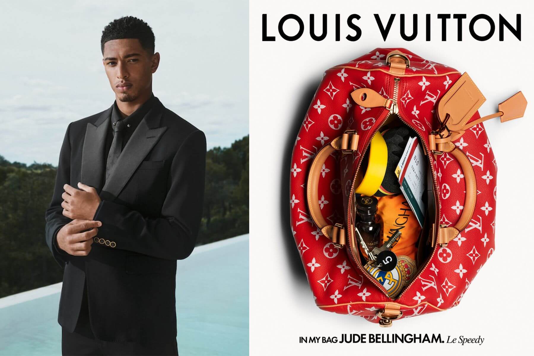 這位英格蘭足球天才的紅色 Speedy P9 裝滿了身為「空中飛人」的奔波寫照 。包裡隨手可見機票與護照,並收納了一件代表榮譽的個人官方球衣 。為了在旅途中保持最佳狀態,他還隨身攜帶一瓶路易威登 Ombre Nomade 香水,以及掛著個性化吊牌的鑰匙扣 。