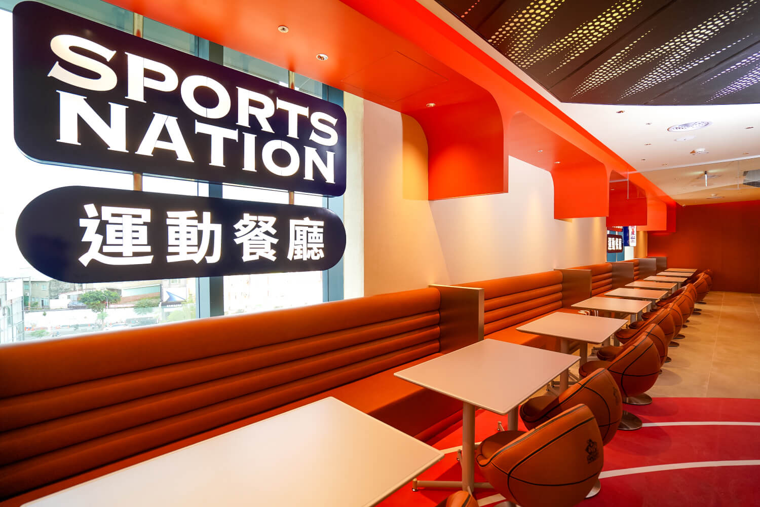 台南店最引人注目的是1184×112公分的超大弧形螢幕,即時播放各類運動賽事與潮流資訊,讓觀眾彷彿置身比賽現場。整體空間以橘色系為主調,搭配金屬未來感設計,籃球造型座椅與賽道圖騰地板強化運動氛圍。