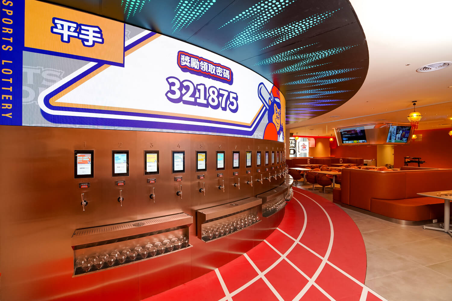 SPORTS NATION最具話題性的設計,是獲台灣專利的「電子酒精交易所」結合自助智慧取酒牆系統。每款酒價格根據實時銷量動態調整——越熱門的酒款價格越高,漲幅最多達120%;若半小時無人購買則降價4%,最低可下殺至半價。