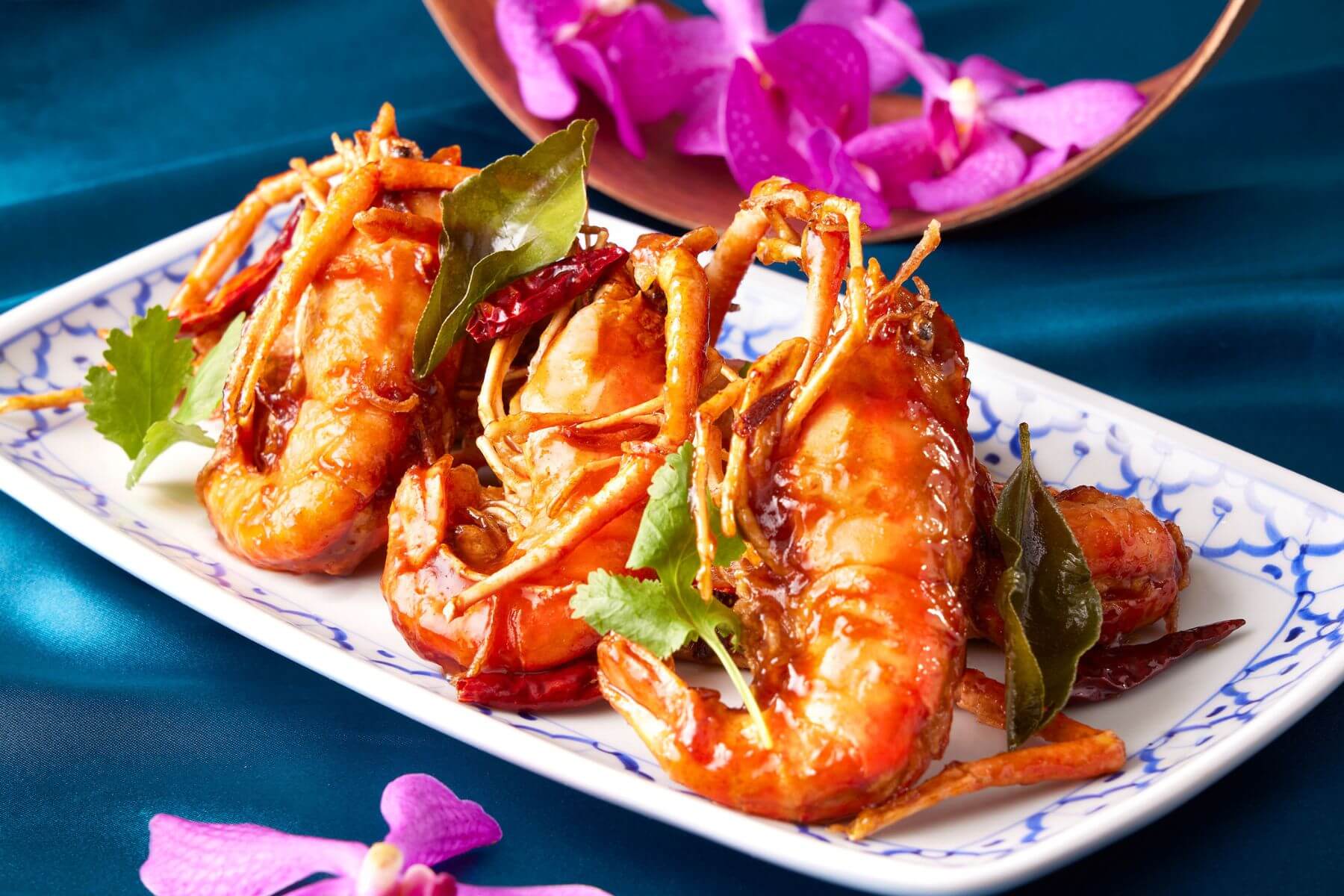 「酸辣冬蔭泰國蝦炒飯」是將首都菜經典冬蔭風味入菜,以主廚自製的冬蔭醬、辣椒醬與新鮮香茅為主體,與九層塔及檸檬葉一同打製成特調醬汁,與香米一同燴炒,讓酸辣滋味醬汁與鮮美海味於口中併發。