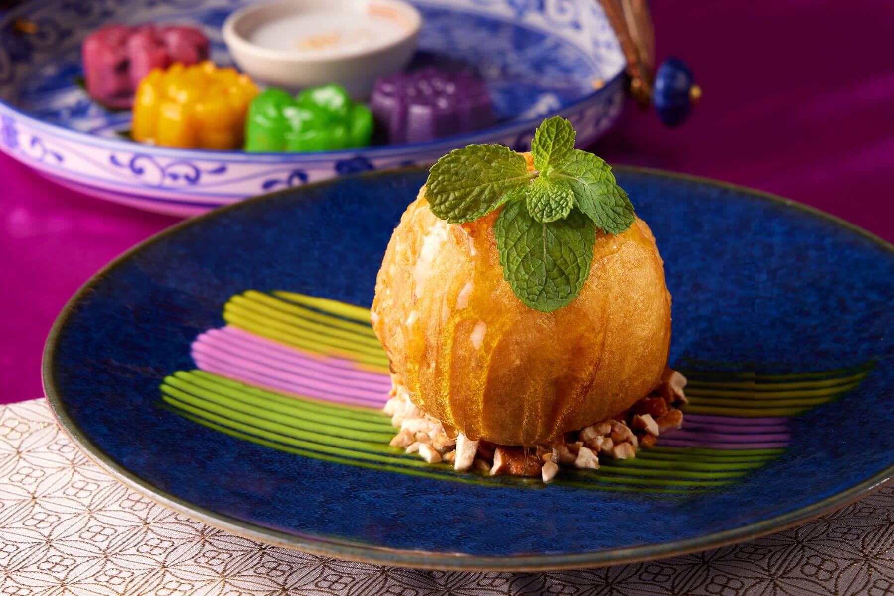 「手工酥炸冰淇淋」則是主廚以泰國普吉島常見的油炸冰淇淋為靈感,以磅蛋糕碎包裹香草冰淇淋,沾裹椰奶、芝麻及椰子粉等磨製的酥炸粉一同油炸,淋上香甜蜂蜜及腰果碎,冰火交融雙重味覺饗宴。