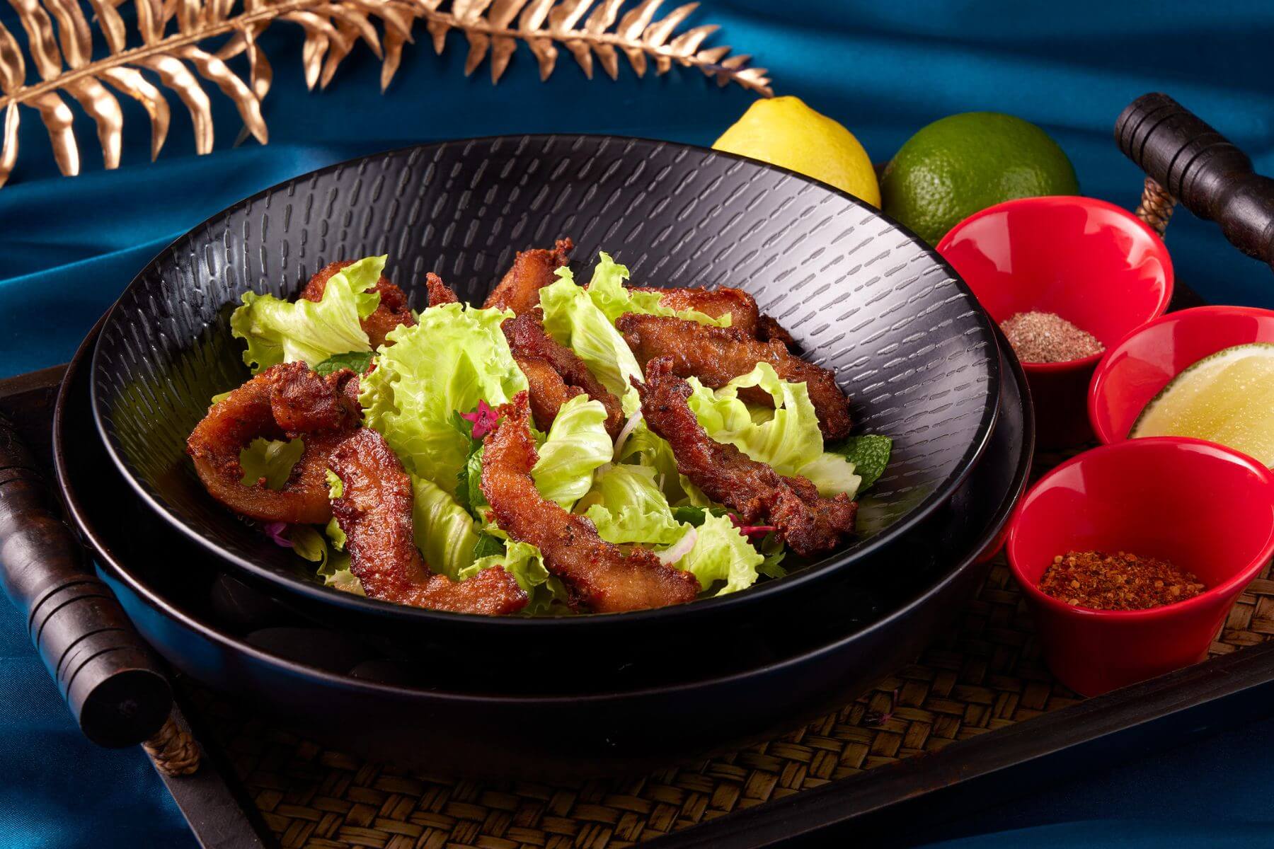 開胃菜「脆皮松阪豬沙拉Moo Klook Foon」是主廚在曼谷英迪格酒店時獨創招牌菜,以東北伊善地區家喻戶曉的「炸豬頸肉Khao Moo Tod」為發想,運用當地特色炒米,配上辣椒、黃薑、檸檬葉等香料製成特製辣粉,與魚露、檸檬汁、砂糖等佐料,拌上炸至金黃酥脆的松阪豬以及生菜,爽脆生菜中和松阪豬的油香、醬汁酸辣開胃,不僅成為該酒店的招牌菜色,也多次登上媒體成為人氣名菜。