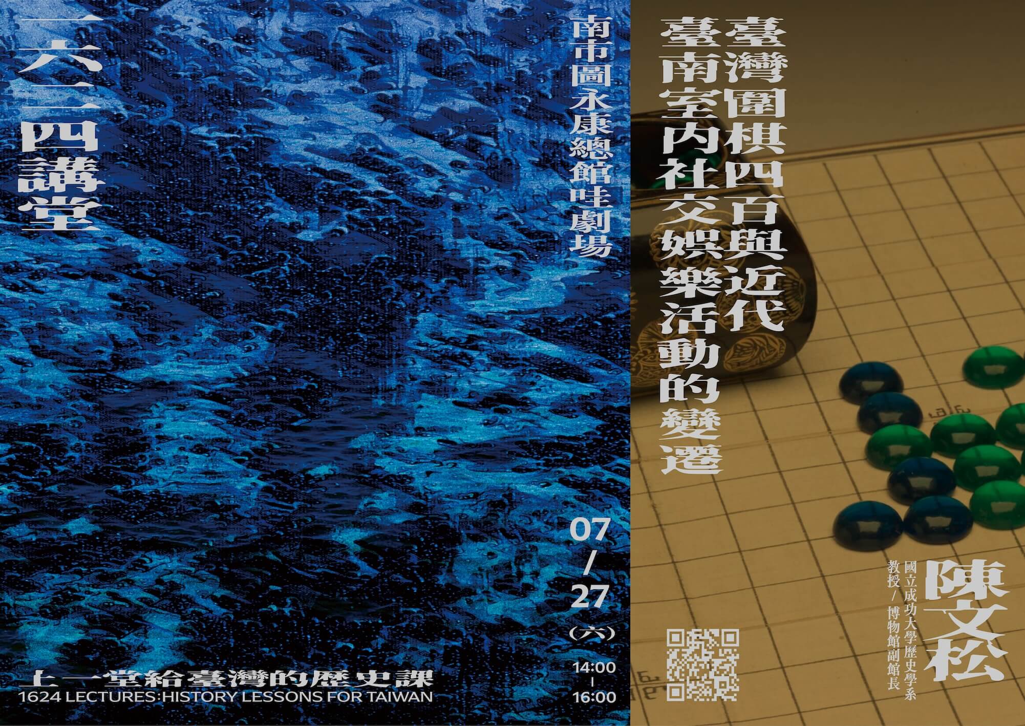 1624 講座透過宏觀的歷史演變到微觀的在地文化,慢慢重建出臺南的歷史。國立臺灣歷史博物館館長張隆志以〈國姓爺在臺南〉,為人們導讀府城公共歷史記憶中的鄭成功。臺史博副研究員石文誠解密臺南書信史料,從 1665 年鄭經寫給荷蘭人的一封信帶領大家走入東寧王國。中央研究院臺灣史研究所研究員林玉茹從歷史人物施琅,切入談 17 世紀末臺灣最大的地主和海商。成功大學博物館館長吳秉聲以建築歷史與文化資產保存的研究專業,探討臺南這座歷史城市的空間構成與文化蘊含,而副館長陳文松則從臺灣圍棋的微觀角度切入,探討近代臺南室內社交娛樂。