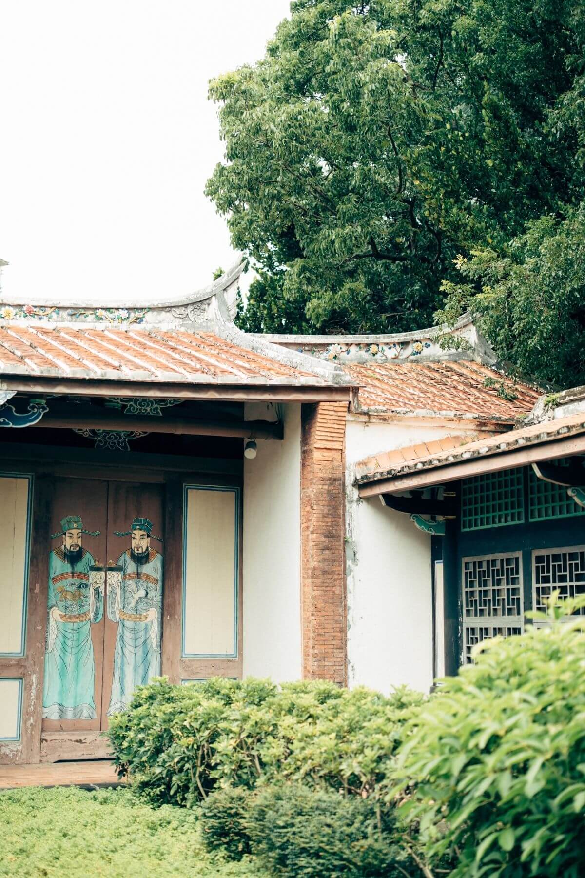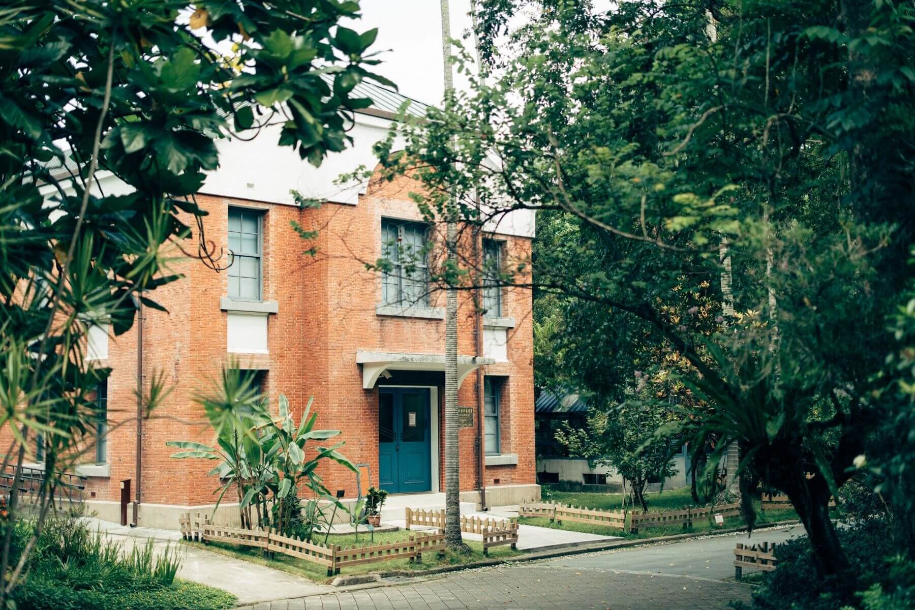 從薑區往西北側前進,可見二層樓的西式紅磚建築以及繪有門神的中式四合院建築,有如時空錯置。董景生解說,磚造建築為1924年落成的腊葉館,為當時研究、收藏植物標本的空間,充滿大正時代風情的台灣漫畫《採集人的野帳》即以此處為故事舞台。