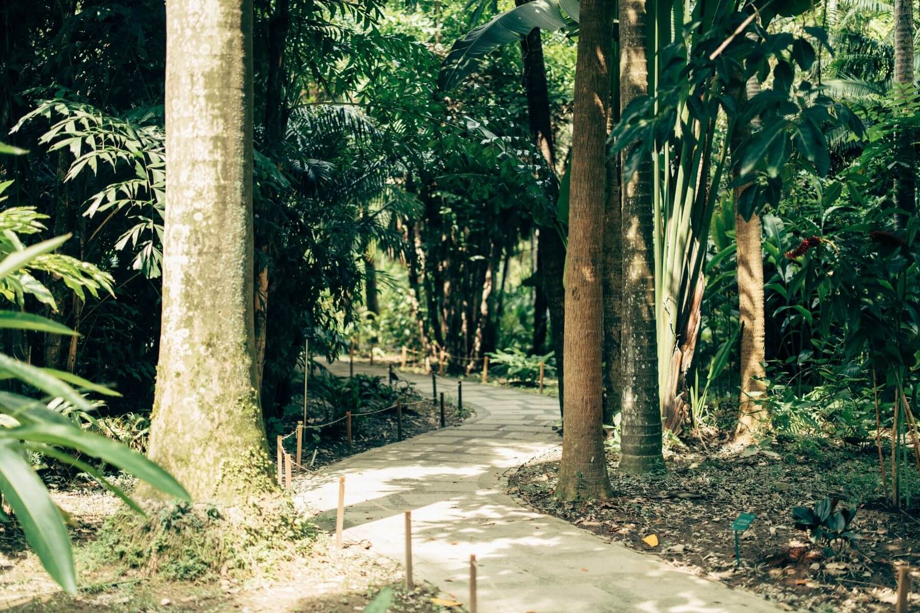 走進台北植物園,漫步於高聳的椰子樹蔭下,在水泥叢林裡難得飽嘗熱帶風情。細看展示牌,園中植物經主題規畫,錯落有致。除了傳統分類,在這裡還可以找到以十二生肖命名的植物、文學、佛經中的植物。光線陰暗的枕木步道兩側種植約200種蕨類,甚至有一處稱作療癒庭園,視覺之外,還能靠觸覺及嗅覺來欣賞。