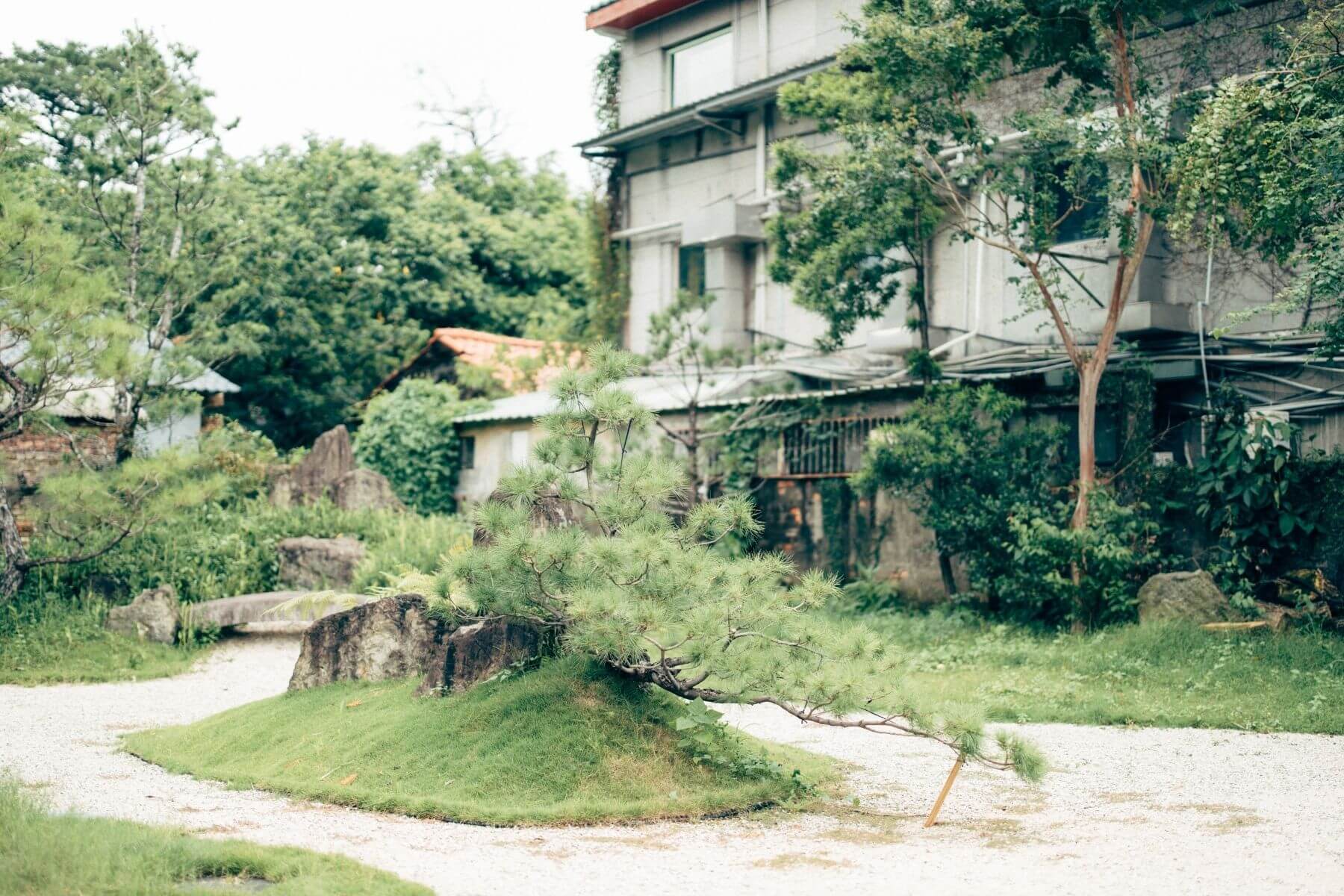 同時,禮聘日本庭作師小口基實設計枯山水庭園。董景生指出庭園淺色碎石上的「龜」、「鶴」兩座小島,龜的四肢及頭部清晰可辨,不似日式寫意含蓄。原來小口基實來台考察後,認為台灣文化比日本文化更直率,加上台灣的龜山島意象,便在此座枯山水庭園中,打造具象的龜鶴二島。