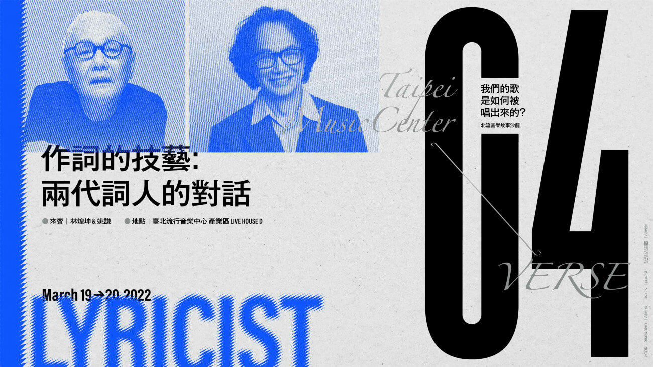 一首歌如何廣為流傳,歌詞絕對佔有重要地位,要朗朗上口或者雕琢辭藻,其考量程度並不亞於編曲製程,流行風格與曲式或許會不斷轉變,但作詞的技藝與歌曲背後精彩的故事,仍值得深究。此次座談邀請到林煌坤與姚謙兩位重量級作詞人,他們都在各自的作品中,記錄不同時代的樣貌。七、八零年代是林煌坤創作最活躍的時期,作詞超過千首,並留下〈往事只能回味〉、〈祝你幸福〉等經典歌曲;姚謙接續林煌坤的薪火,從九零年代至今創作不輟,有〈魯冰花〉、〈我願意〉、〈記念〉等代表作。