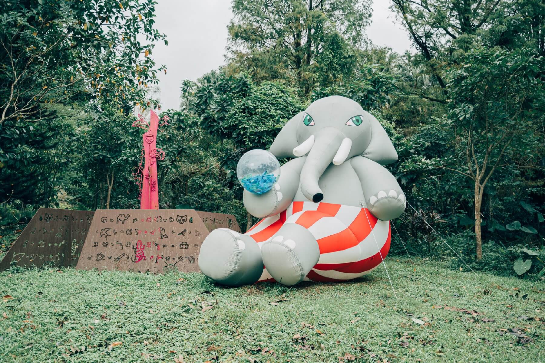 今年的臺北里山川公共藝術計畫,藝術家王振瑋運用園藝布料剩材塑造的布條裝置《山川縷縷》,以及藝術家張育嘉使用寶特瓶回收材料並融合互動燈光裝置,創作出作品《體操象》,同樣充分展現永續理念。