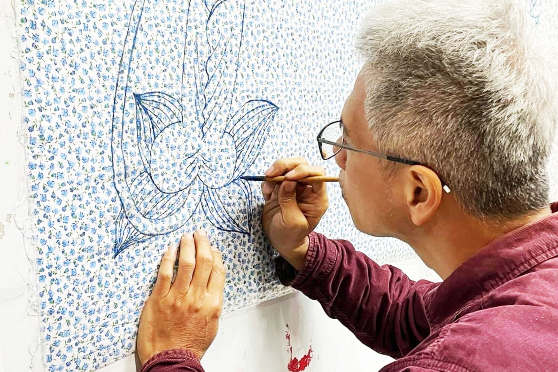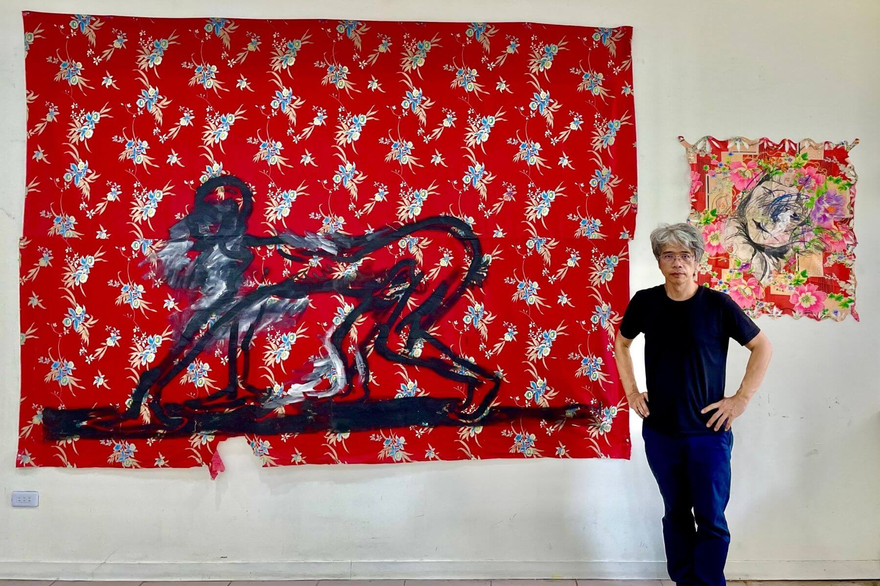 侯俊明與早期花布作品合影,左至右:《高更的女人》(1987)、《哎呦》(1986) (圖片提供:藝術家、亞紀畫廊)