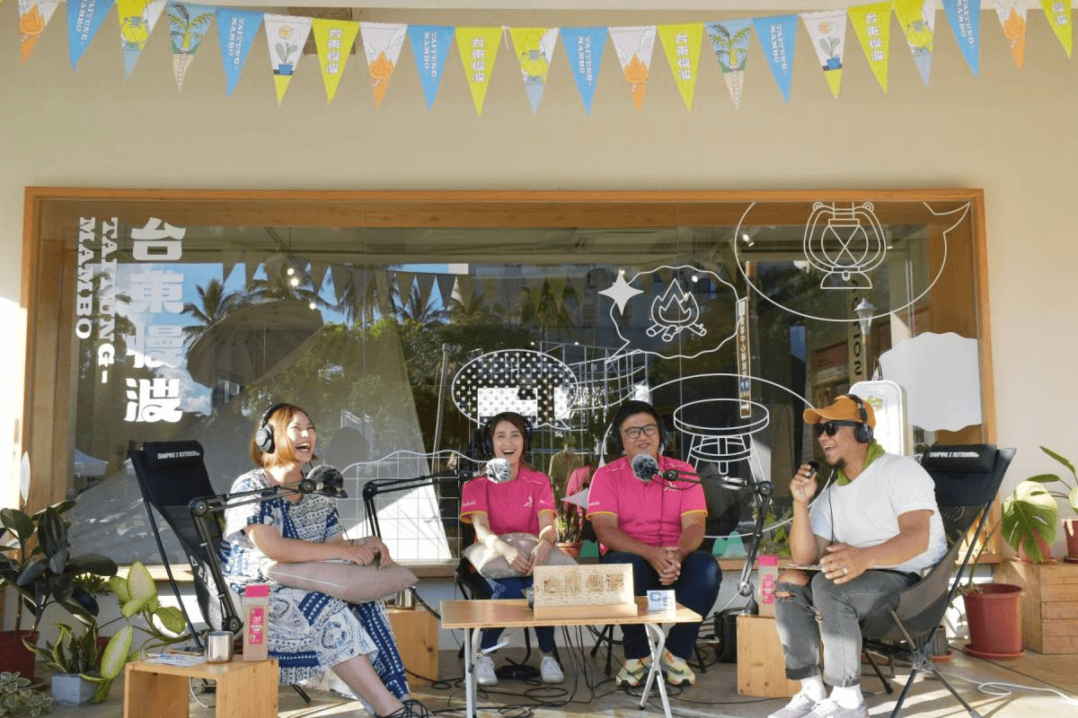 點開臺東設計中心所企劃的podcast節目「台東慢波電台」,以台東金曲歌王陳建年的〈Amis的饗宴〉開場,即使身在台東幾百公里外的城市,也能一下子被帶到台東的一角:位於臺東設計中心一樓,由露營椅、木箱和帳篷所搭建的錄音空間,開放的空間讓民眾能夠在錄音時參與,聽兩位主持人Rita和Sam訪問受訪者和他們的故事。
