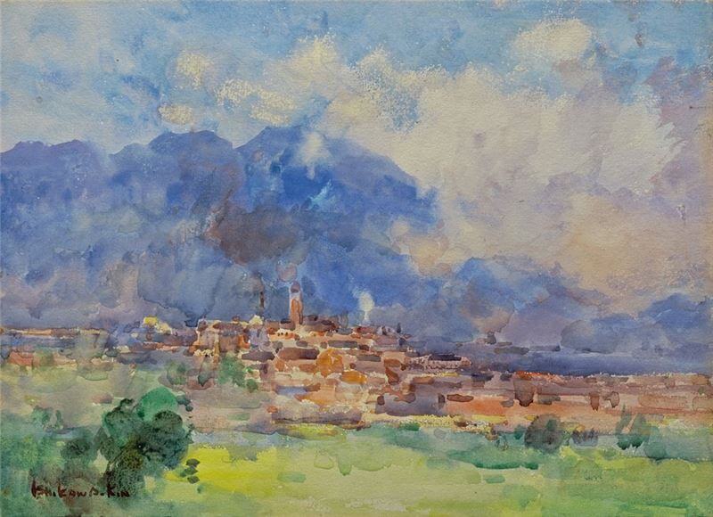 石川欽一郎,《從圓山神社眺望臺北》,1930,水彩畫,25.8×35.3cm。(圖/文化部提供)