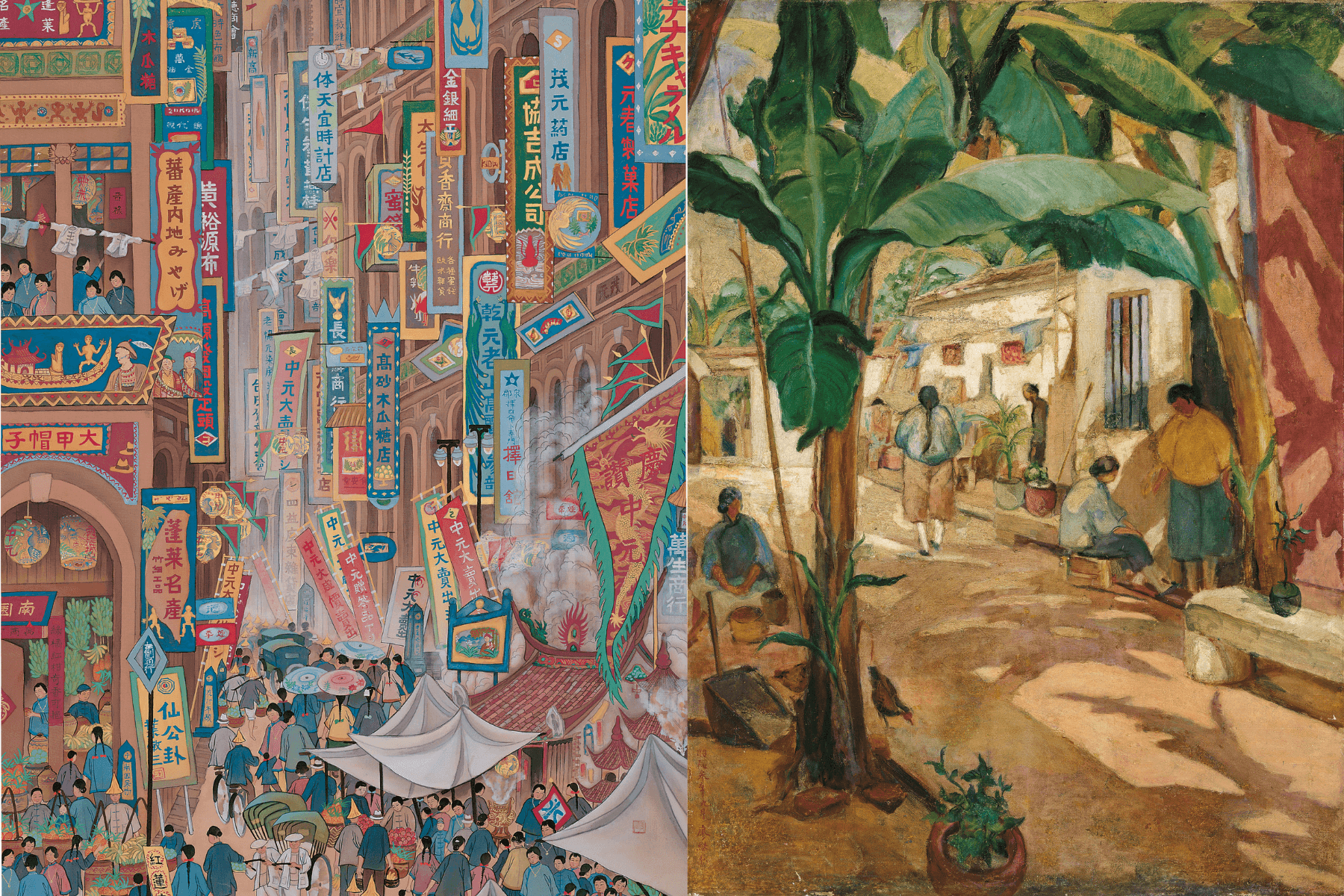 左起為郭雪湖,《南街殷賑》,1930,膠彩、絹,188×94.5cm;廖繼春,《有香蕉樹的院子》,1928,油彩、畫布,129.2×95.8cm,臺北市立美術館典藏。