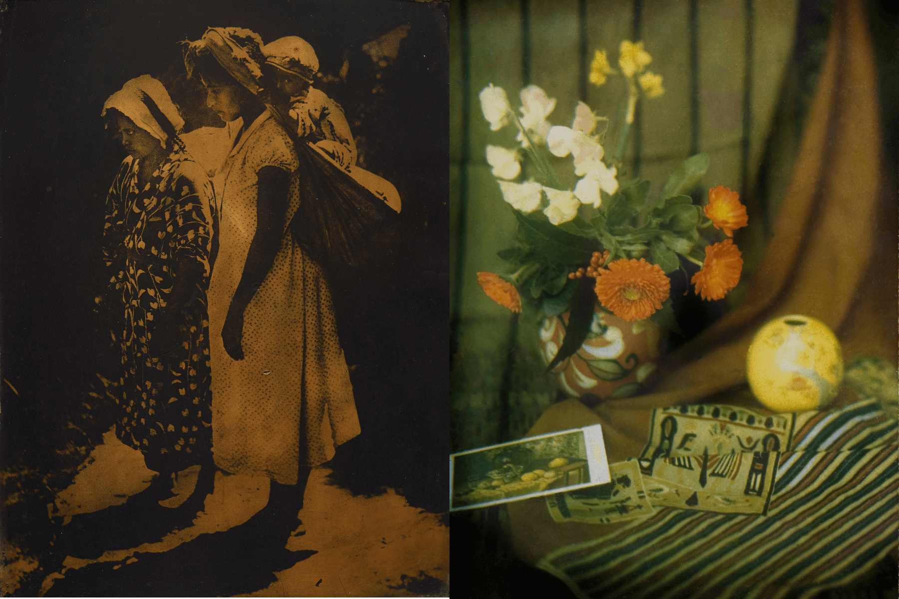 左起為彭瑞麟,《太魯閣之女(漆金版)》,1934-1938,攝影(金漆技法),37×31.5cm(含框),家屬收藏;彭瑞麟,《靜物之影中影(東京)》,1930,攝影(三色碳墨轉染天然寫真印畫法),15×10.5cm,家屬收藏,臺北市立美術館提供。
