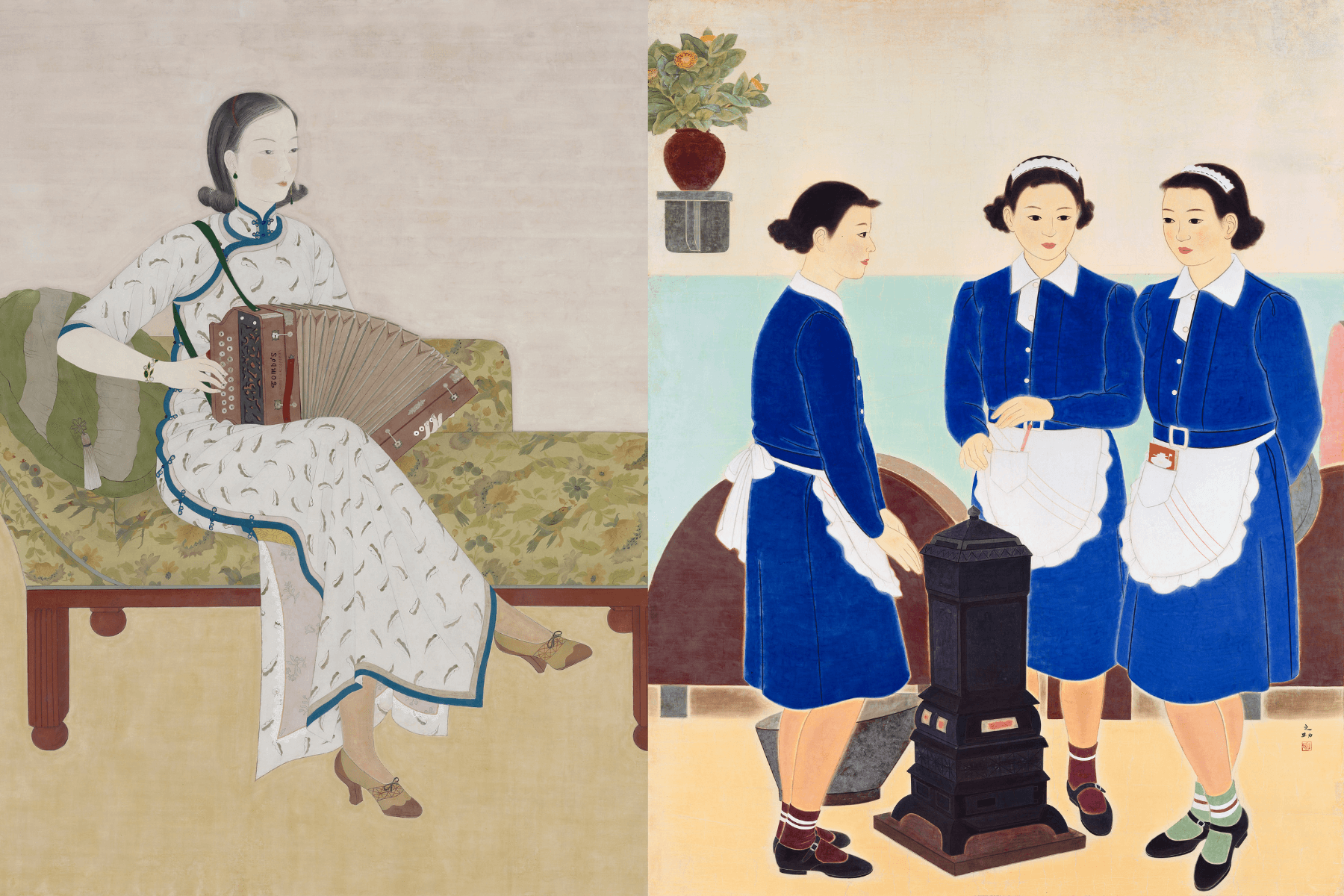 左起為陳進,《手風琴》,1935,膠彩、絹,180×170cm;林之助,《小閒》,1939,膠彩、紙,195.5×152cm,臺北市立美術館典藏。