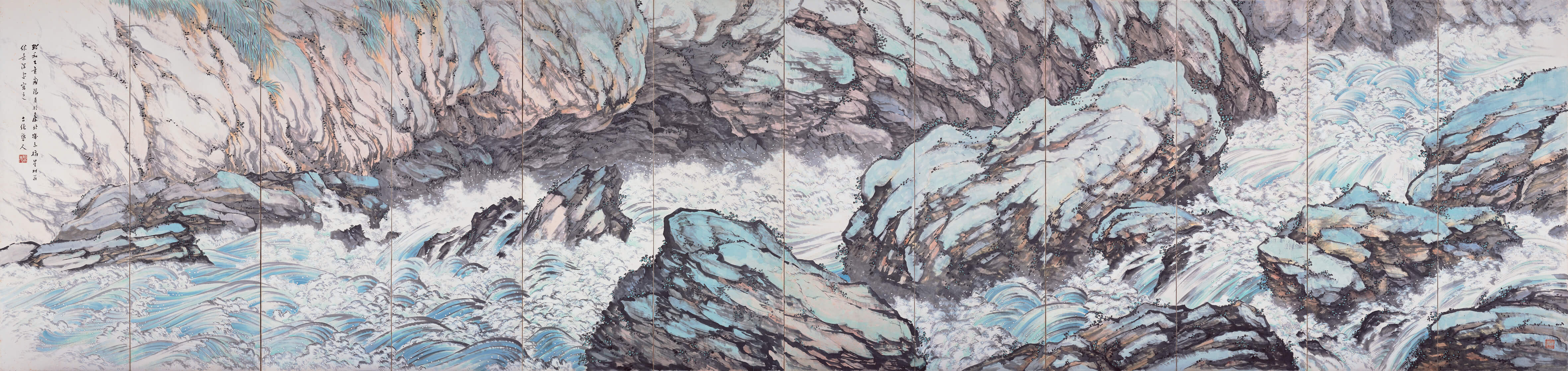 鄉原古統,《台灣山海屏風──內太魯閣》,1935,水墨、紙,175.3 × 61.6cm(12片),臺北市立美術館典藏。