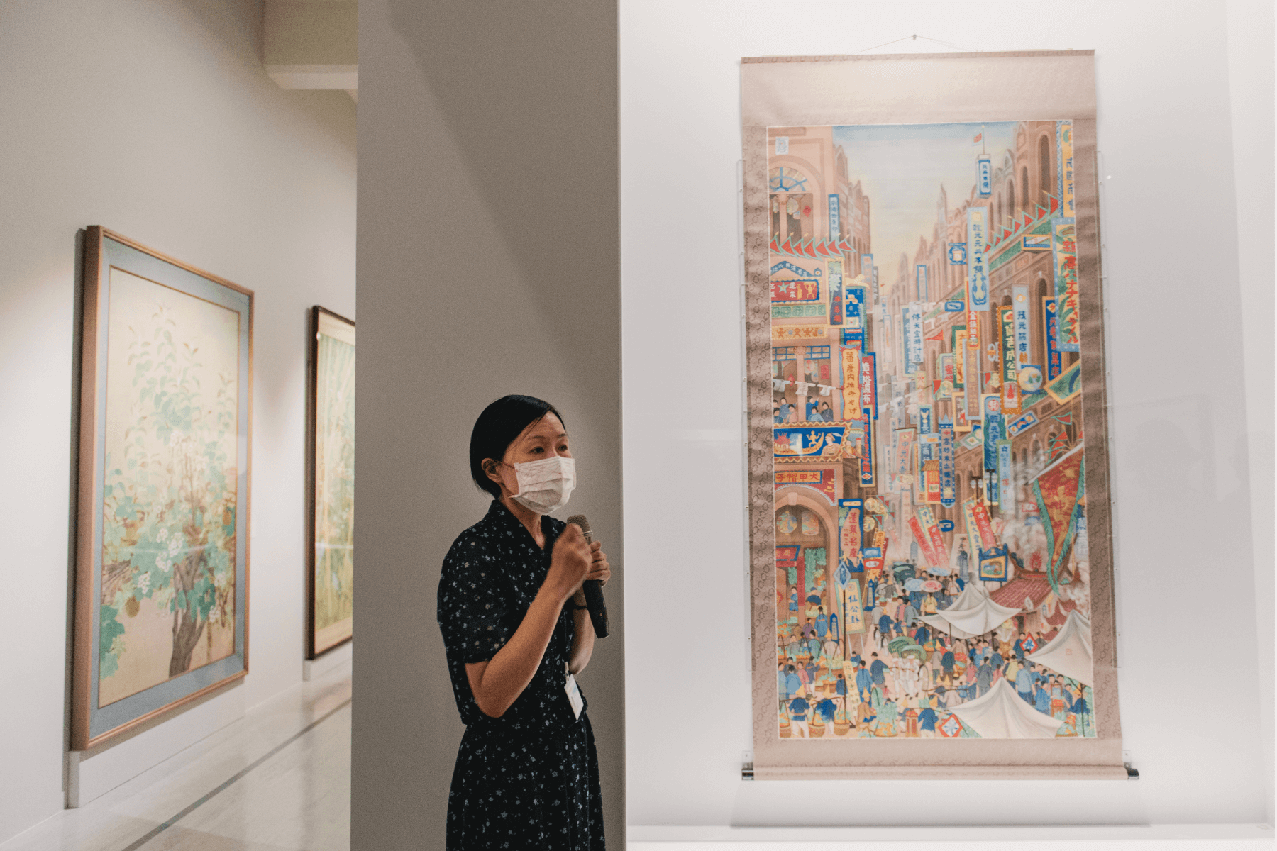 策展人余思穎正在導覽郭雪湖之作《南街殷賑》。