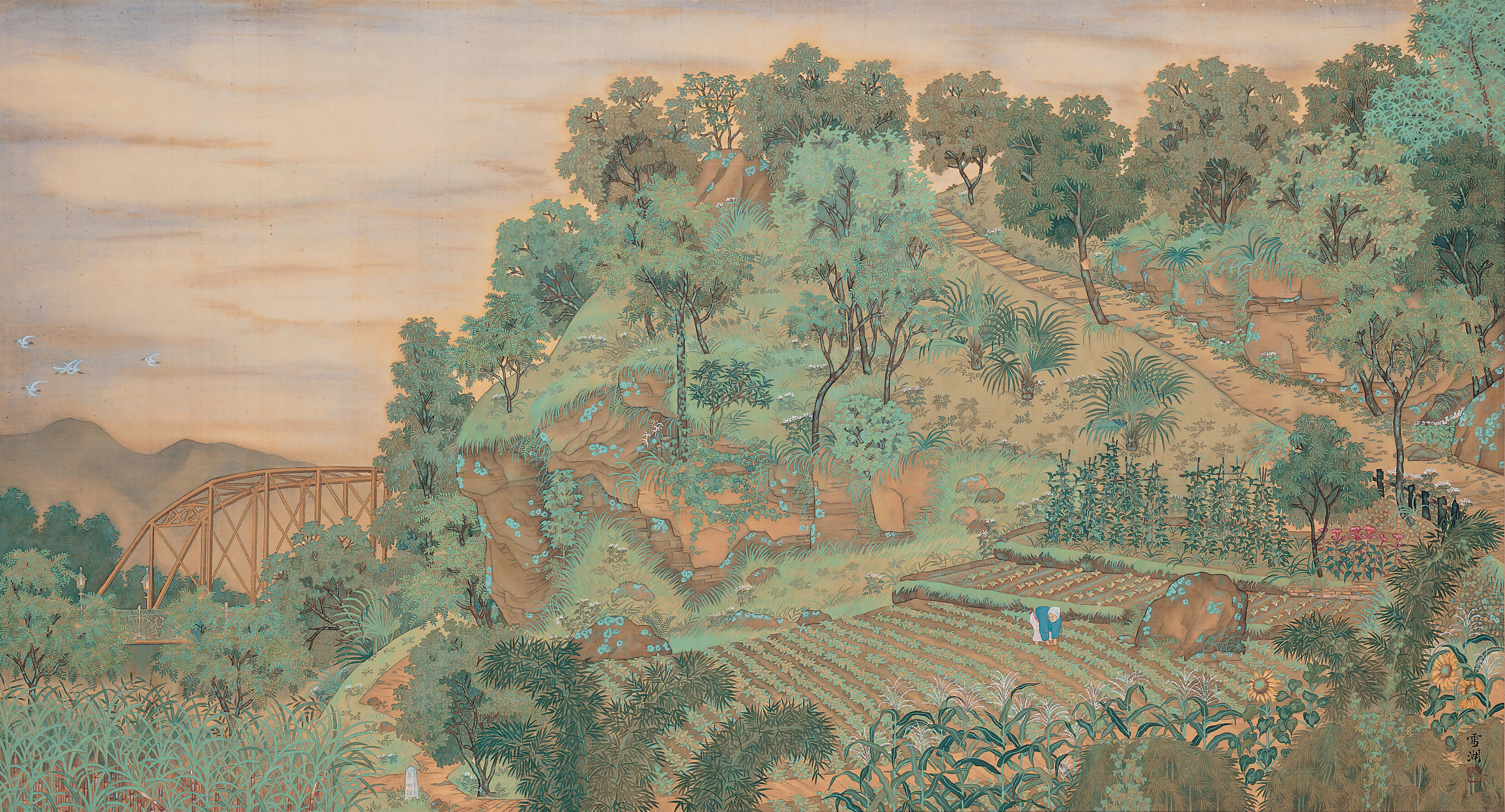 郭雪湖,《圓山附近》,1928,膠彩、絹,94.5×188cm,臺北市立美術館典藏。