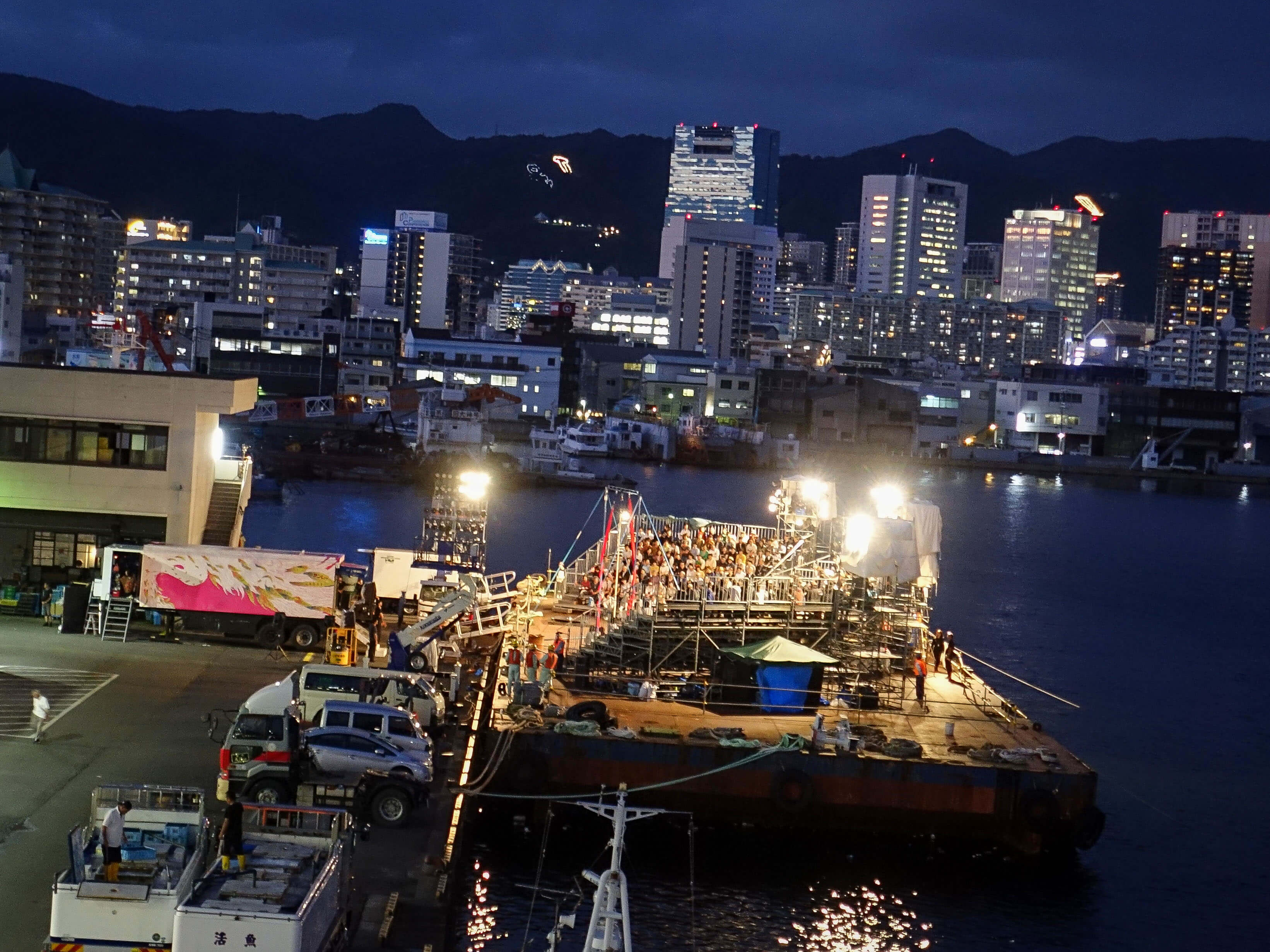 那是場緊鄰神戶港邊上的演出,舞台車面向著港區停放,後方就是神戶最大的中央魚市場,觀眾席被設置在港區海面的浮台上,從高點鳥瞰環繞舞台車的神戶港,柳美和邊和我介紹四周環境,邊指著遠端川崎造船的船塢,說裡頭正建造的是海上自衛隊的潛水艇,港埠、海鳥、漁船、貨輪、潛水艇、濕黏的海風,加上來自台灣的舞台車,霎時變得夢幻,卻也如假包換。