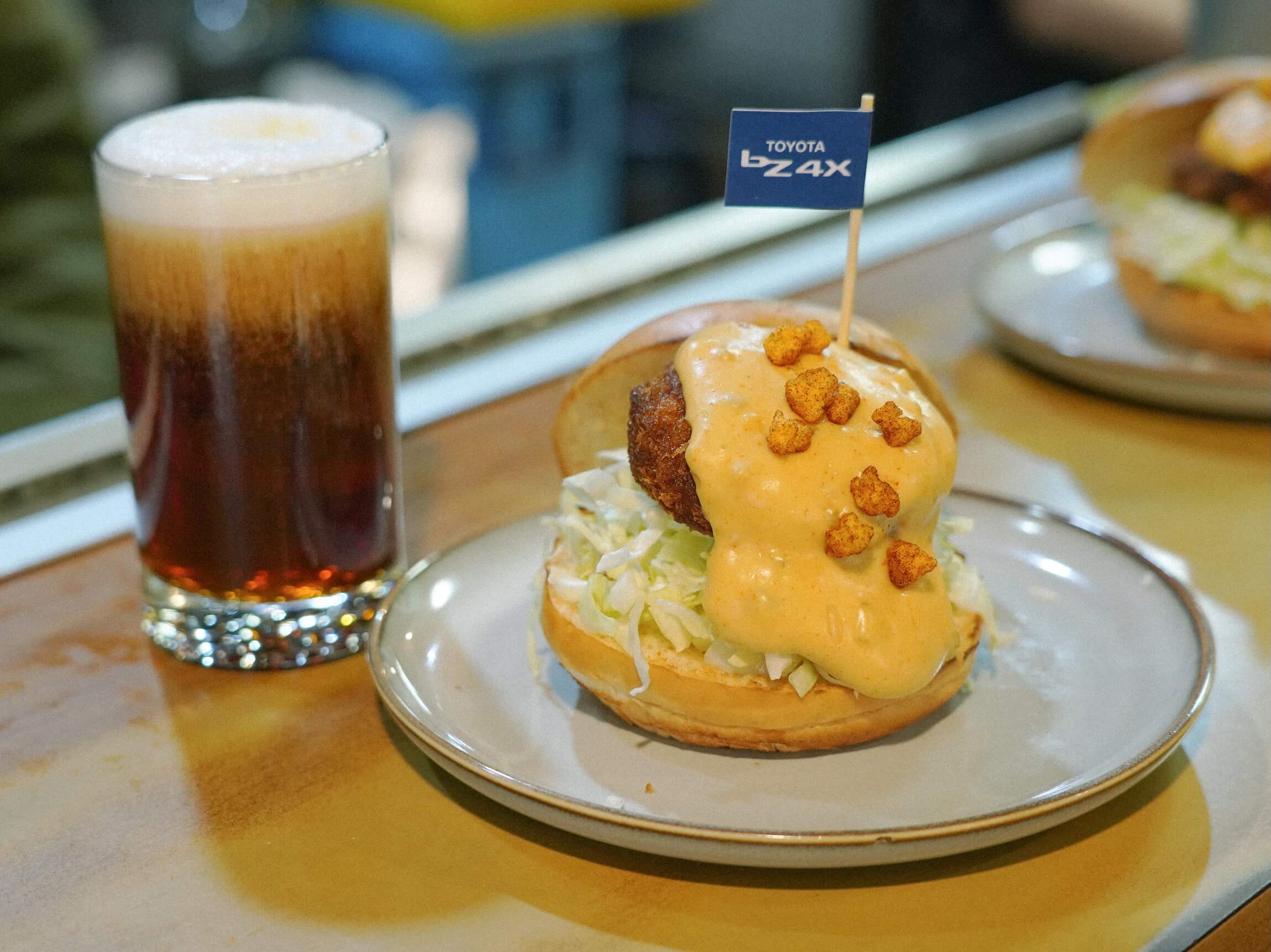 為 bZ4X 設計的「充飽香氣咖哩雙人餐」,以分享為前提。炸雞咖哩外層酥脆,內部保留肉汁,咖哩香氣厚實卻不躁;牛筋咖哩燉煮得軟而入味,油脂與香料交融,讓味道在口中停留。小菜與味噌湯讓節奏稍微放慢,昭和布丁的甜度不高,像是一段緩衝,冰紅茶則替整餐留下清爽出口。