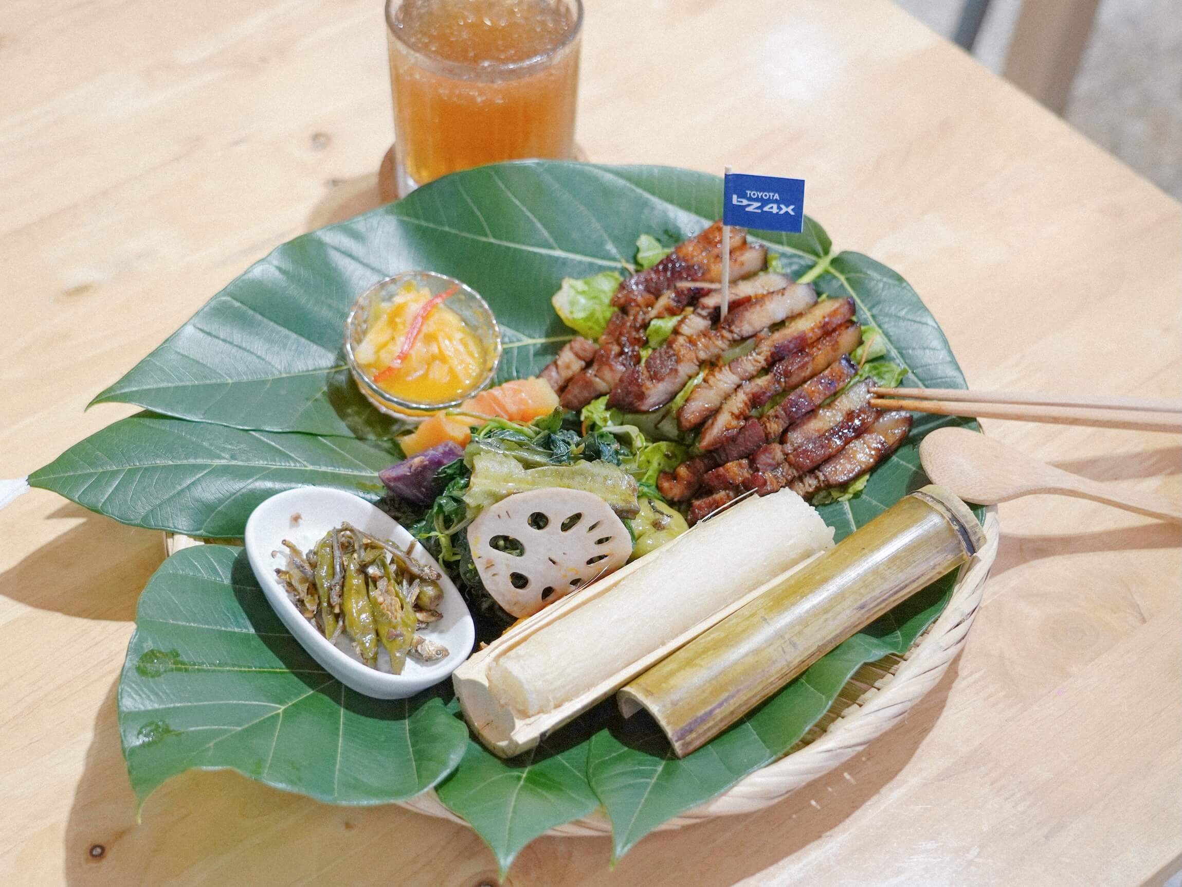 這次為 bZ4X 打造的 「電力滿格烤肉飯套餐」,靈感直接來自花蓮的日常風景。料理沒有刻意堆疊技巧,而是選擇讓食材自己說話。主食的米來自花東縱谷,粒粒分明,撐起整份餐點的結構;馬告醬的香氣來自山林,帶著微微的辛香與柑橘調性,貼合豬肉的油脂;山線的伊娜黃金泡菜與當季野菜,則替味道加入清爽與酸度;海線的小魚與糯米椒,把海風帶進餐桌。