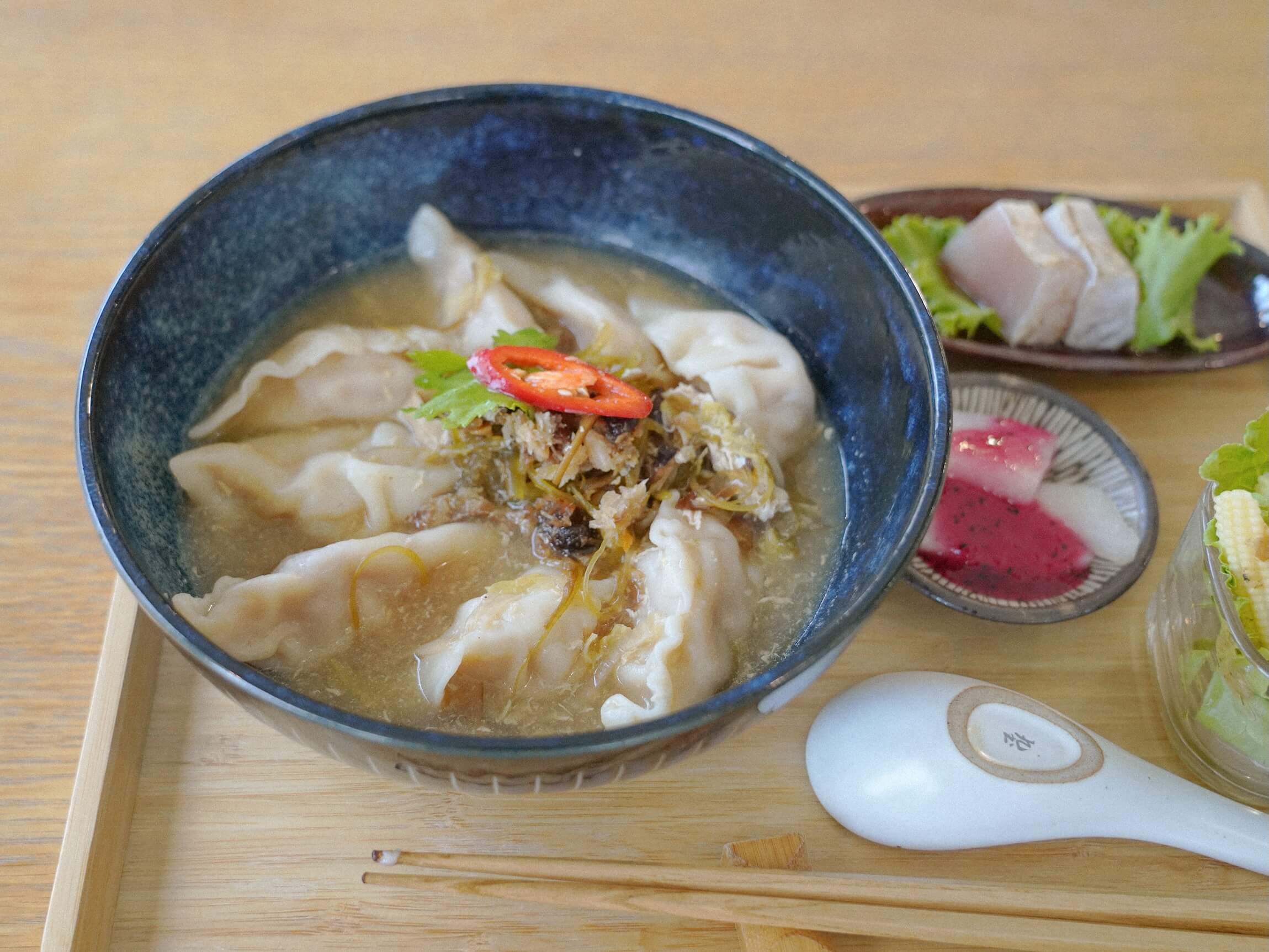 為了這趟環島旅程,成功海銀行端出「浪遊海餃能量套餐」。料理的想法來自漁民餐桌的組合方式,沒有主菜與配菜的分別,而是一整套彼此呼應的味道。魚肉水餃選用旗魚或鬼頭刀製作,口感紮實,搭配海菜羹湯與飛魚醬,鹹鮮層次慢慢展開。旗魚生魚片切得乾淨,保留海水的清甜;涼拌海菜與梅子醋蔬菜沙拉讓味覺回到清爽的位置;火龍果醬醃蘿蔔帶著輕微果酸,花生豆腐則替整份餐點收尾。