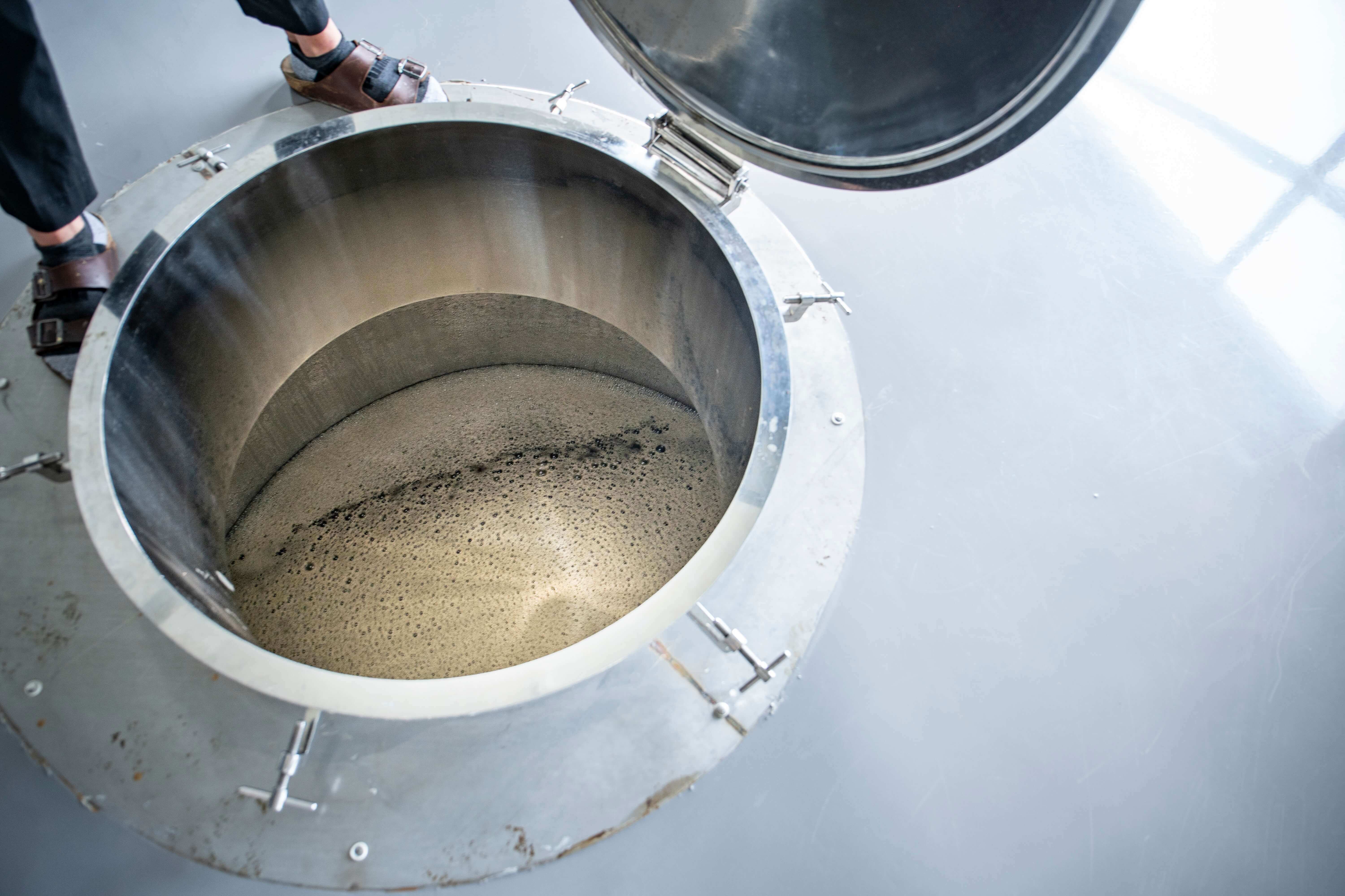 陳千浩帶著我們走進發酵槽區,空氣中瀰漫著甜膩的番薯香與米麴的發酵氣息。「這是兩段發酵,」他解釋,「先讓米跟麴菌加水發酵,麴菌釋放酵素把澱粉變成糖,然後酵母菌再把糖變成酒精。這叫複合併行式發酵。」