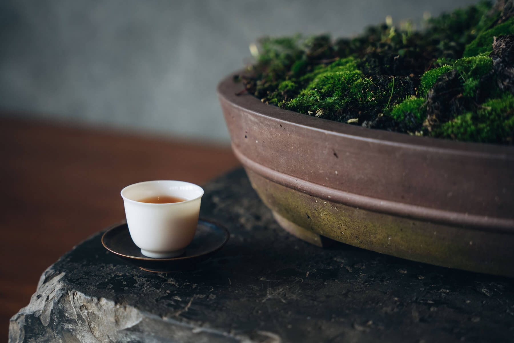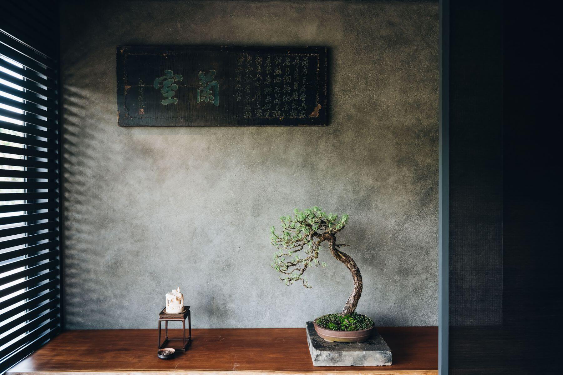 2022年初春,莊鎔璞又落實了一項夢想已久的計畫:在莊記茶業頂樓打造品飲空間「莊記茶室」,林炳輝以「食養山房」的經典風格為他設計空間——茶室外,是圓石鋪就的枯山水庭園和仿古民家緣廊的露台;落地玻璃採光,令人心緒沉靜的深色調鏽鐵、土牆構成空間主體,地上鋪以手工藺草榻榻米,喜好古物的莊鎔璞,將其收藏許久的文房匾、枝葉遒勁的盆裁、造型優美的手工茶器妝點空間,成為茶室最好的裝飾。