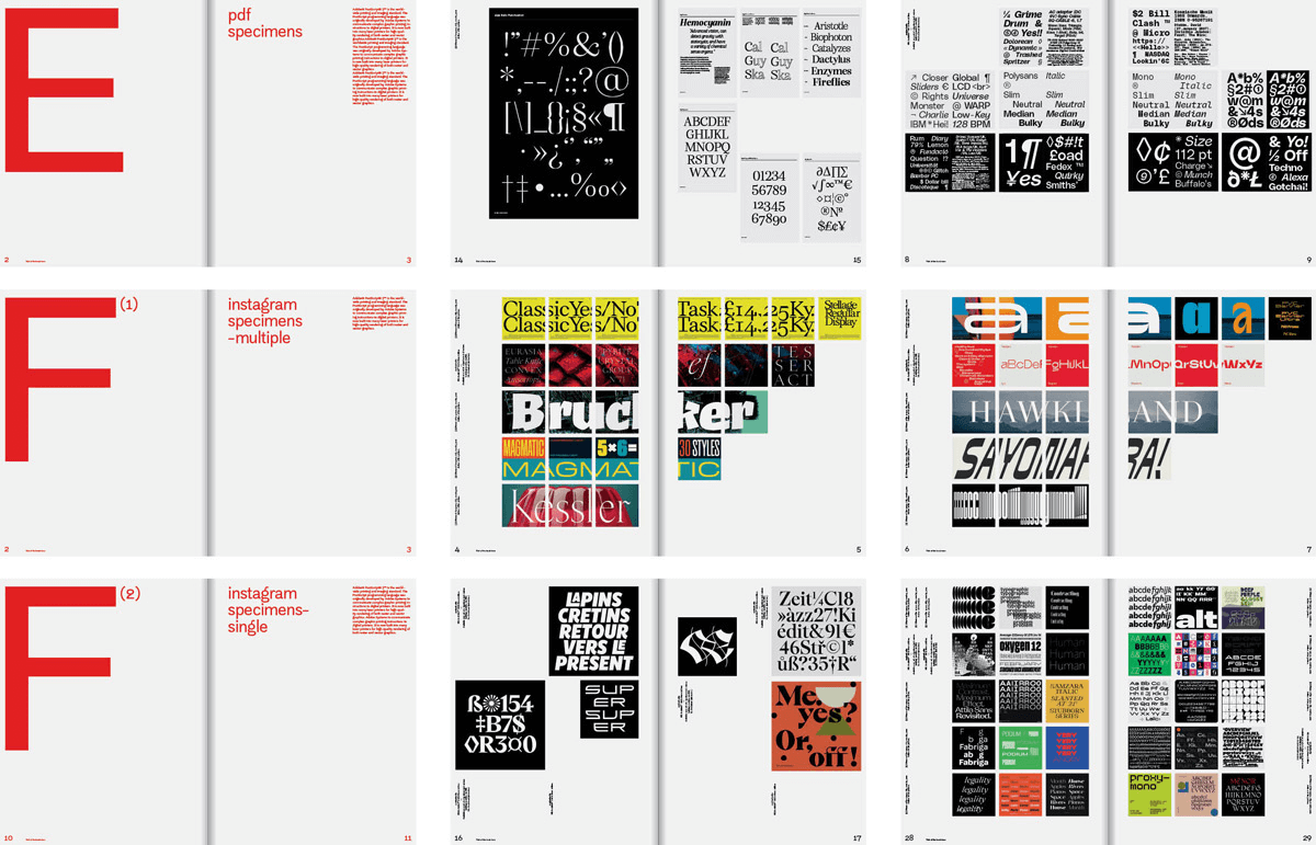 字體樣本,最早是活字印刷時代鑄字廠用於展示和推銷自家字型的小冊子。隨著工業化時代字體種類爆炸式增長,樣本變得更加競爭和視覺化。而進入數位時代,字體樣本非但沒有消亡,反而獲得了新的生命。它掙脫了過往因商業功能而形塑的意圖性束縛,成為了獨立設計師的「遊樂場」——一個能夠自由想象、進行實驗與突破傳統規則的媒介。