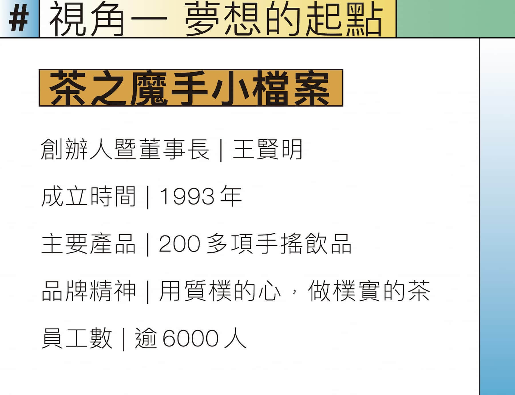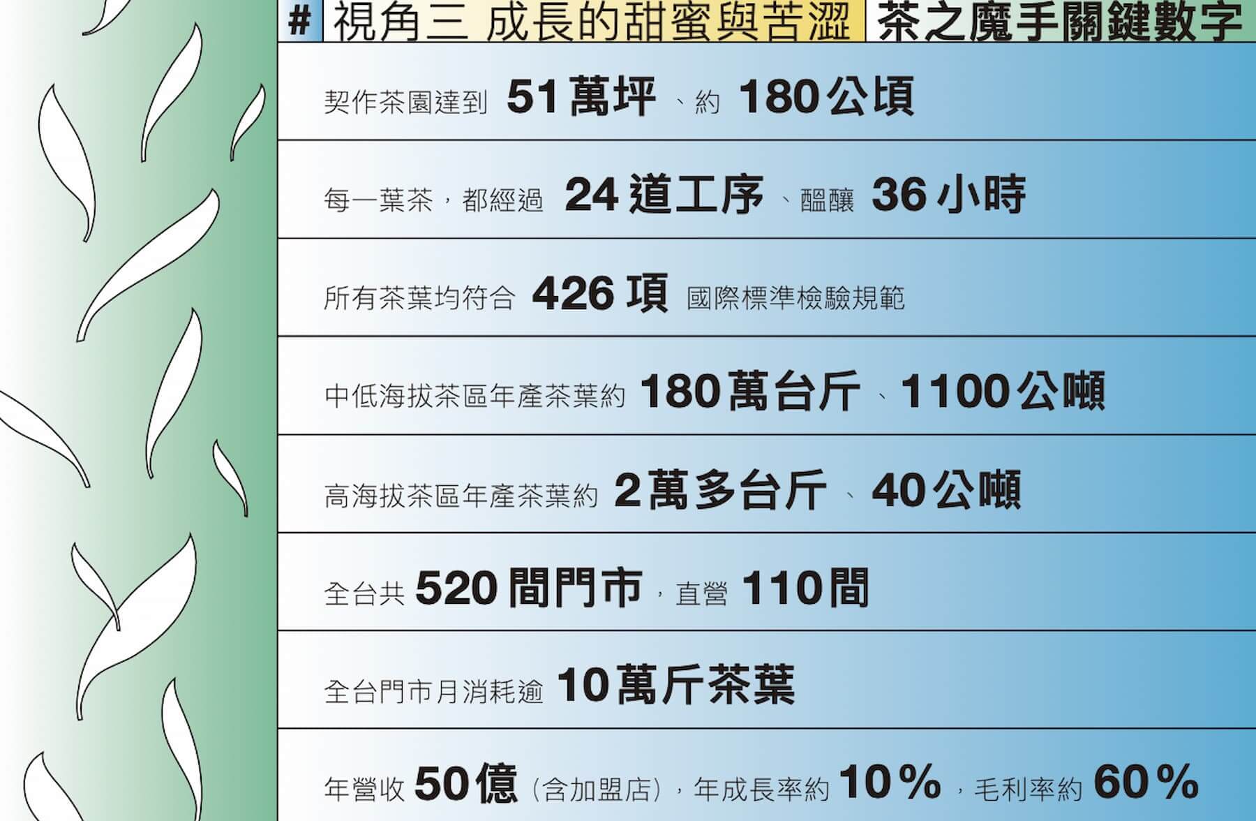 從產地、原料到店面,在完整一條龍供應鏈下,茶之魔手建立起扎實的茶飲王國基礎。王賢明透露,去年茶之魔手的前、後端年營收可達50億,年成長率約10%,毛利高達六成。