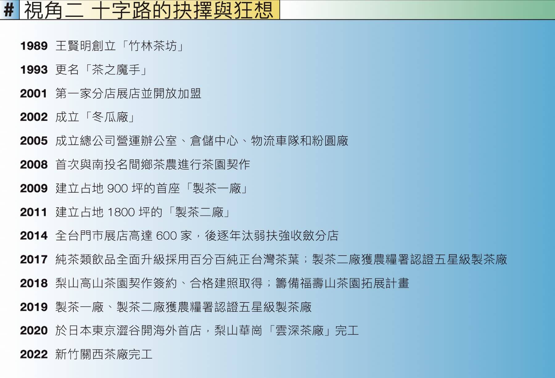 1989年,王賢明在台南創立「竹林茶坊」,1993年更名為「茶之魔手」。農機背景出身的他,創業時從飲品研發、logo設計、泥作和木作等室內裝潢到水電拉線,通通自己親手完成,因此造就了茶之魔手「凡事自己來」的獨特企業文化。