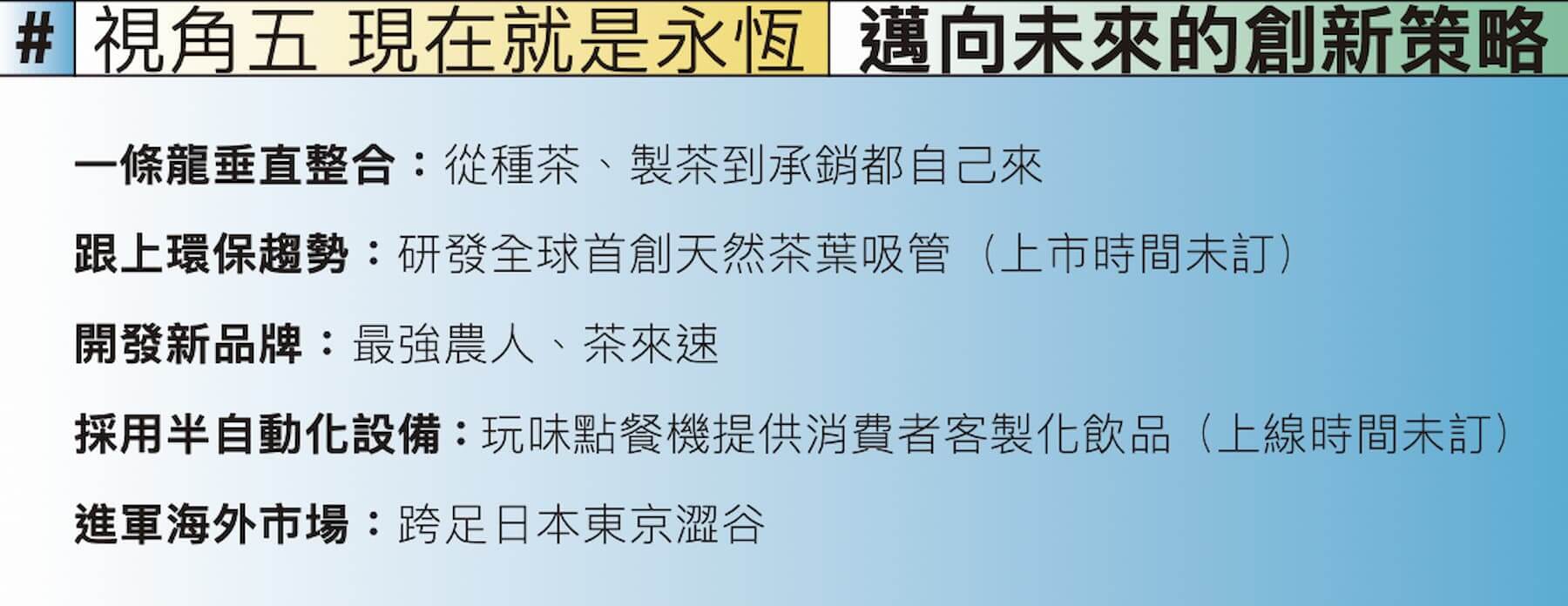 問王賢明未來有想要去美國、歐洲等其他國家市場嗎?向來算得精的他笑稱先不了,待搞定日本再說,「只要根基扎得穩,就算你的葉子暫時受到傷害,最後還是會旺盛起來。」這位對茶著了魔的董事長說得胸有成竹,他將用當初白手起家的氣魄,將茶之魔手帶往更遙遠的地方。