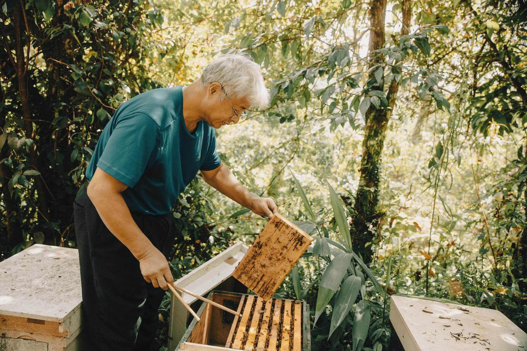 說到森林蜜的生產的源頭,Mo’o就是開啟特富野林下牧蜂事業的第一人。2018年在特富野古道一帶的溪谷設蜂園「拉拉克斯莊園」,從50個蜂箱成長到今日的120個蜂箱,已是小有規模的蜂農。不僅自己牧蜂,還將專業的牧蜂知識大方分享給族人,在生產合作社負責推動部落經營林下養蜂,目前約有十餘位族人斜槓加入牧蜂。