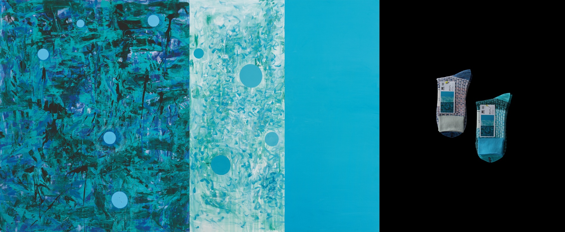 《作品8220》即採用石膏與壓克力顏料,在畫布上拖曳出黏糊狀的有機形體。深綠、亮綠連綴而成數個不規則框形,彼此之間留有寬窄不一的間隙,鵝黃、粉橘、粉藍等顏色則或以點狀、或以塊狀地躍動於其中。為呼應作品既通透明亮又具材質觸感的視覺性,+10・加拾讓襪子局部採用透明底紗,並以特殊的「襪品反穿」思維從反面作設計,彰顯原於裡側的紗線或抽鬚、或毛茸茸的活潑樣態,巧妙呈現陳幸婉作品中藉由石膏與顏料相遇後造成的趣味與張力。
