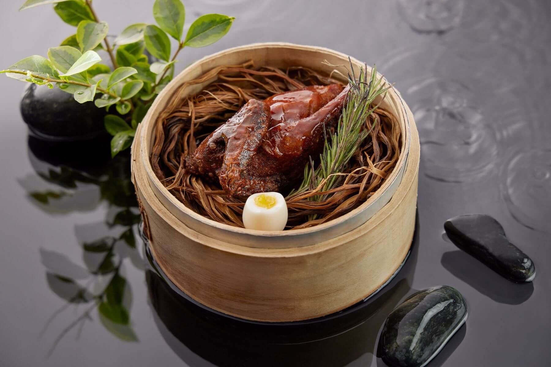 席上佳餚還有「玻璃脆皮乳鴿伴糖心鴿蛋」以滷水慢煮乳鴿讓肉質保有鮮嫩的口感,接著乳鴿表層淋過皮水後風乾,形成晶瑩剔透的外皮,搭配糖心鴿蛋一同放在乾稻草之上,彷彿餐桌上的鳥巢,令人驚豔。