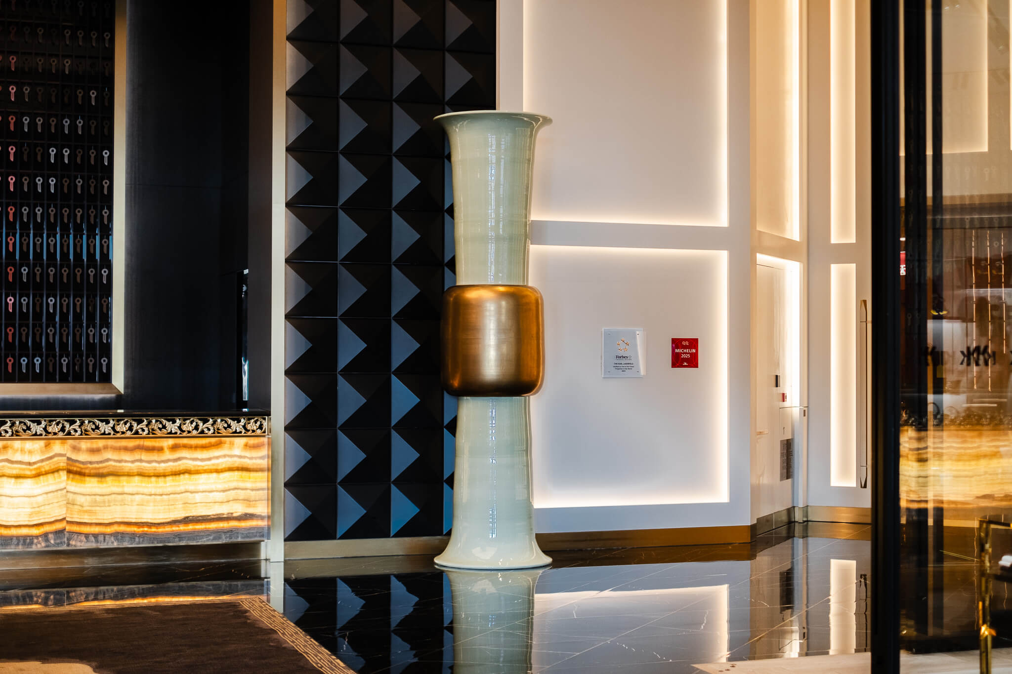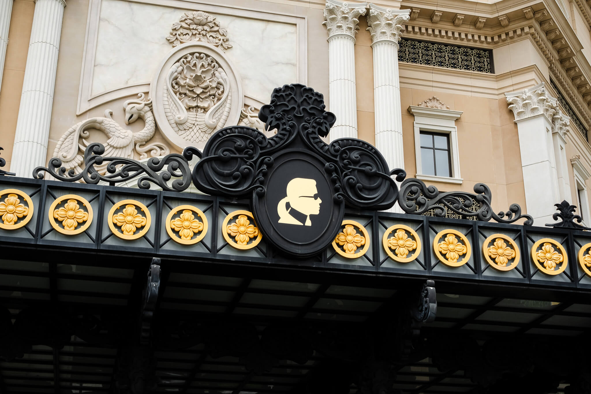 此刻,Karl Lagerfeld的側臉不是印在雜誌封面,也不是掛在精品旗艦店的櫥窗,而是砌進這座由他親自操刀的酒店入口那面牆。這是在提醒所有進門的人:這裡是老佛爺的世界。