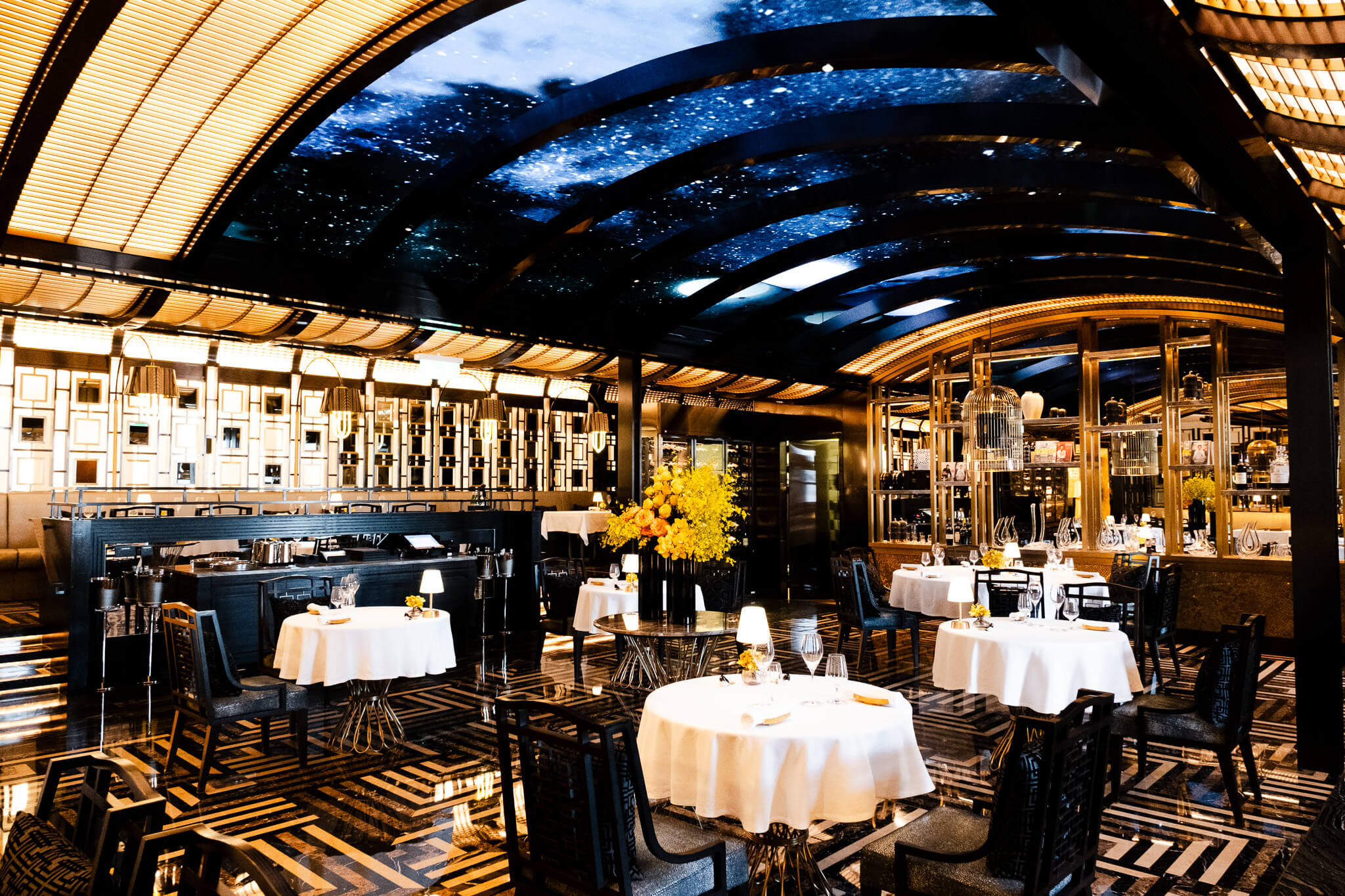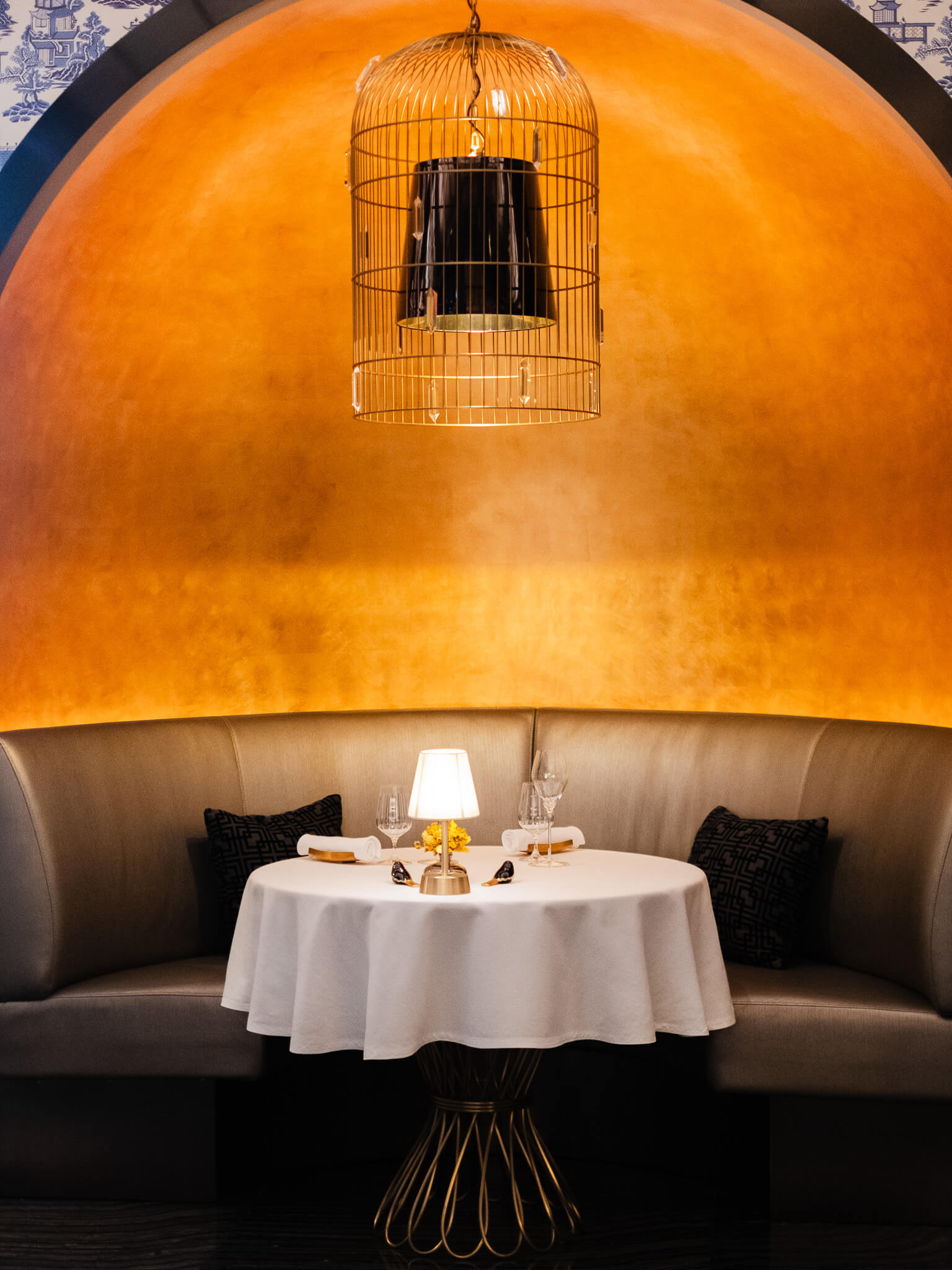 餐廳由首位在里斯本摘得米其林二星的葡萄牙名廚José Avillez主理,菜單以「樂聚共享」的葡式精神出發,食材取自澳門在地風土,調酒靈感則來自中葡兩地的文化地標。連吊燈都做成中式鳥籠的形狀:一個囚籠,但裡面裝的是光。抬頭仰望,主用餐區的LED屏幕上,喜鵲正在飛翔。