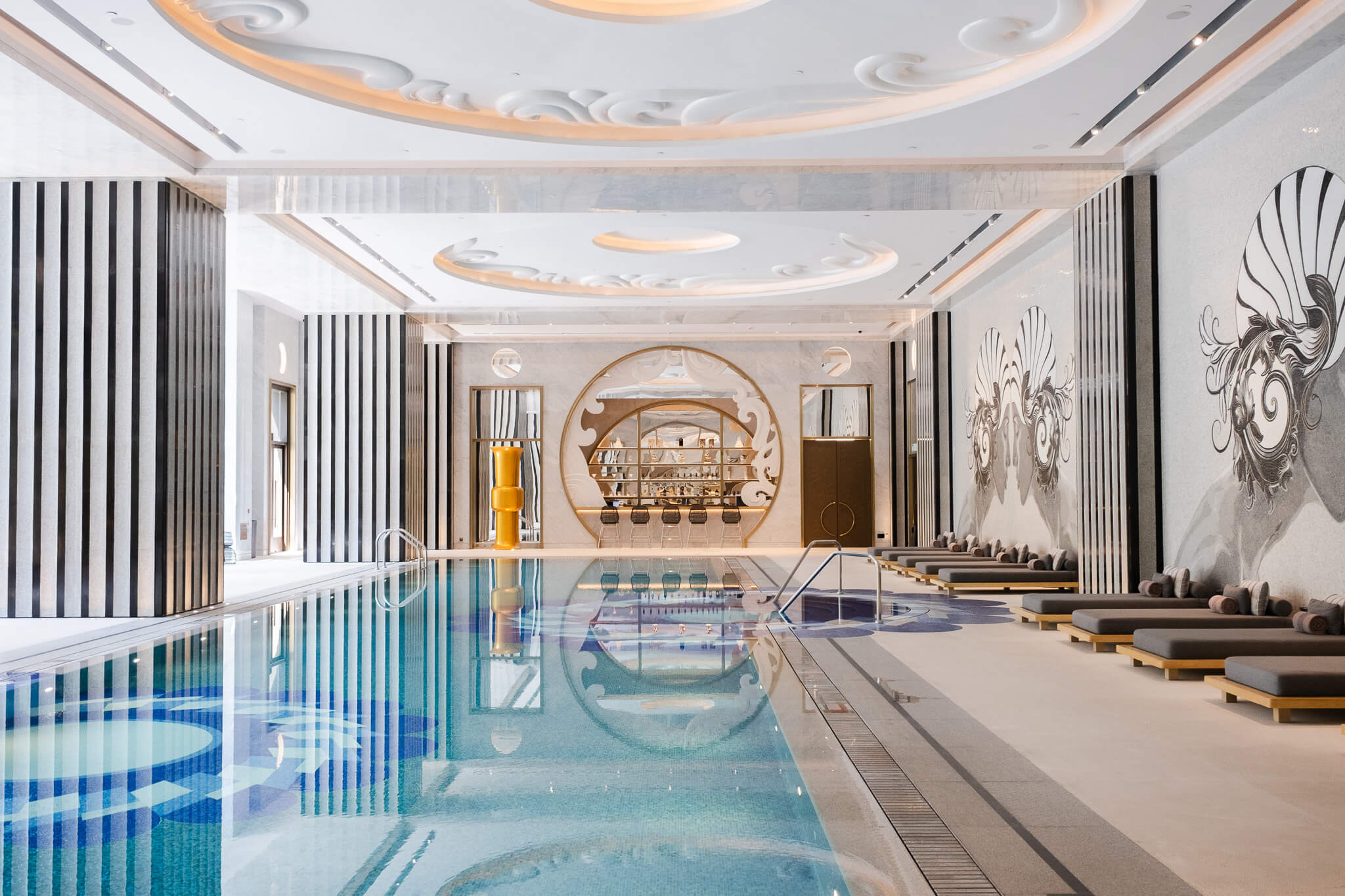 泳池的氣質則截然不同,開闊、明亮,帶著一種地中海度假村的從容。25米室內恆溫泳池與戶外泳池均採用鮮明的馬賽克圖案鋪陳,搭配巨型歐式石柱,在現代度假村的框架裡保留了一種近乎古典的儀式感。池畔遮篷下的躺椅面朝歐式庭園,讓人在水與光之間,暫時忘記這裡是澳門。