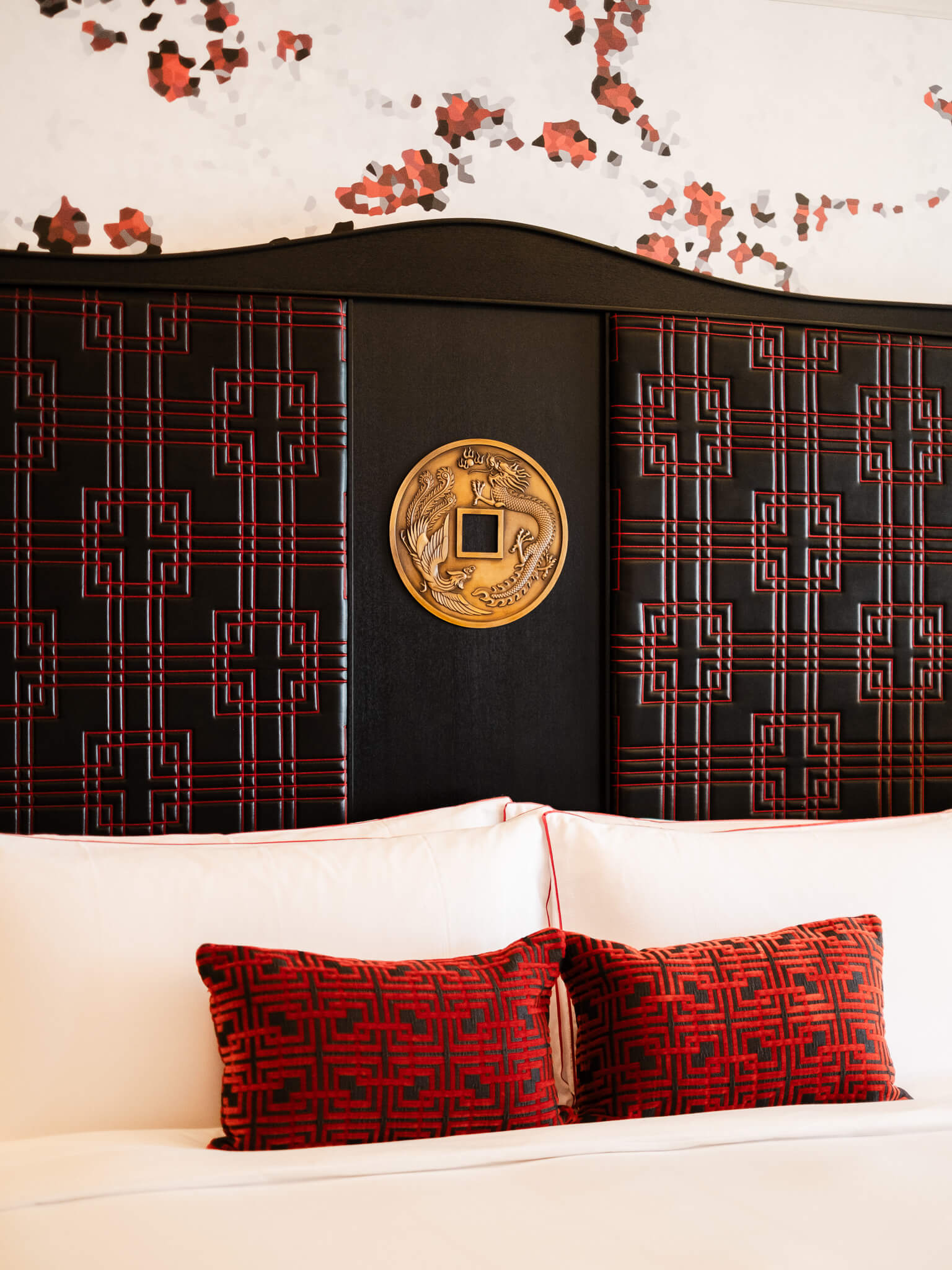 床頭板的線條則源自明代「四出頭官帽椅」。那個向上微揚的弧度被放大、轉化並壓扁成現代感極強的背板,再嵌入銅錢紋樣。明代文人的清雅,遇上歐洲對東方財富的浪漫想像,在同一個平面上交火,卻顯得異常和諧。